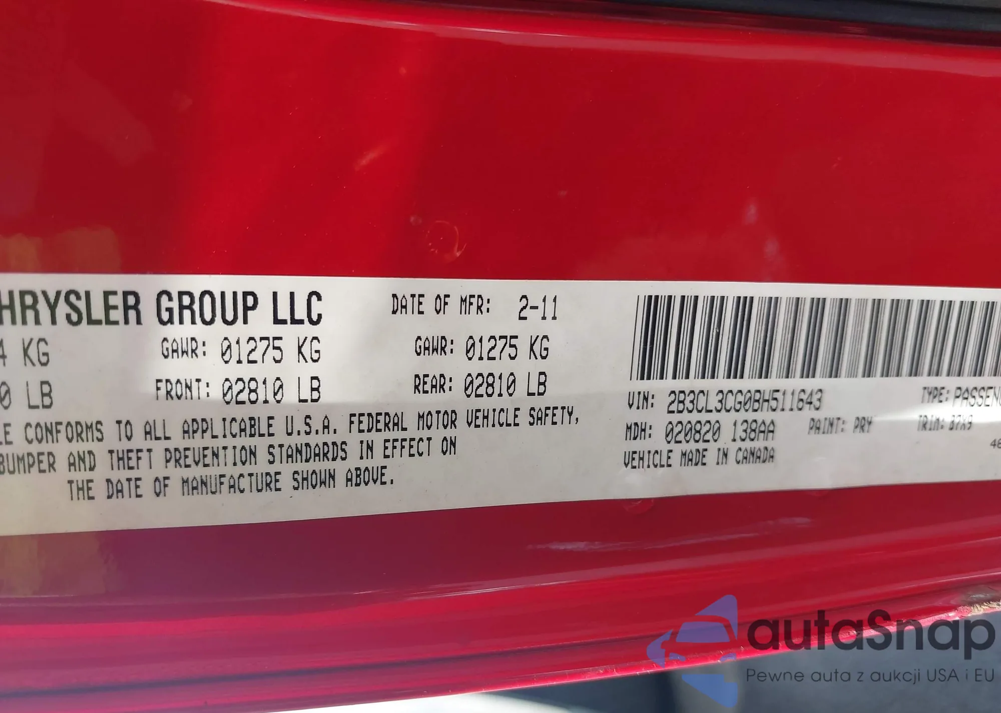 LOT: 42534255 VIN: 2B3CL3CG0BH511643