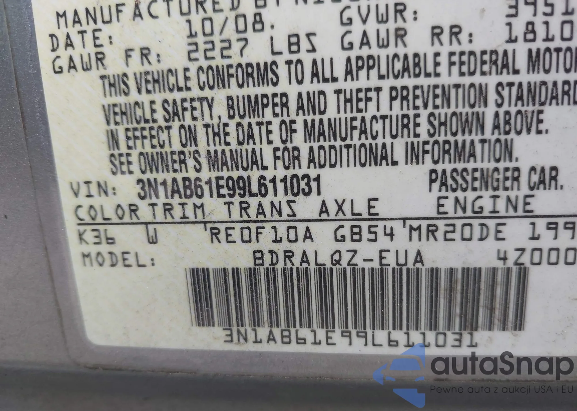 • VIN 3N1AB61E99L611031