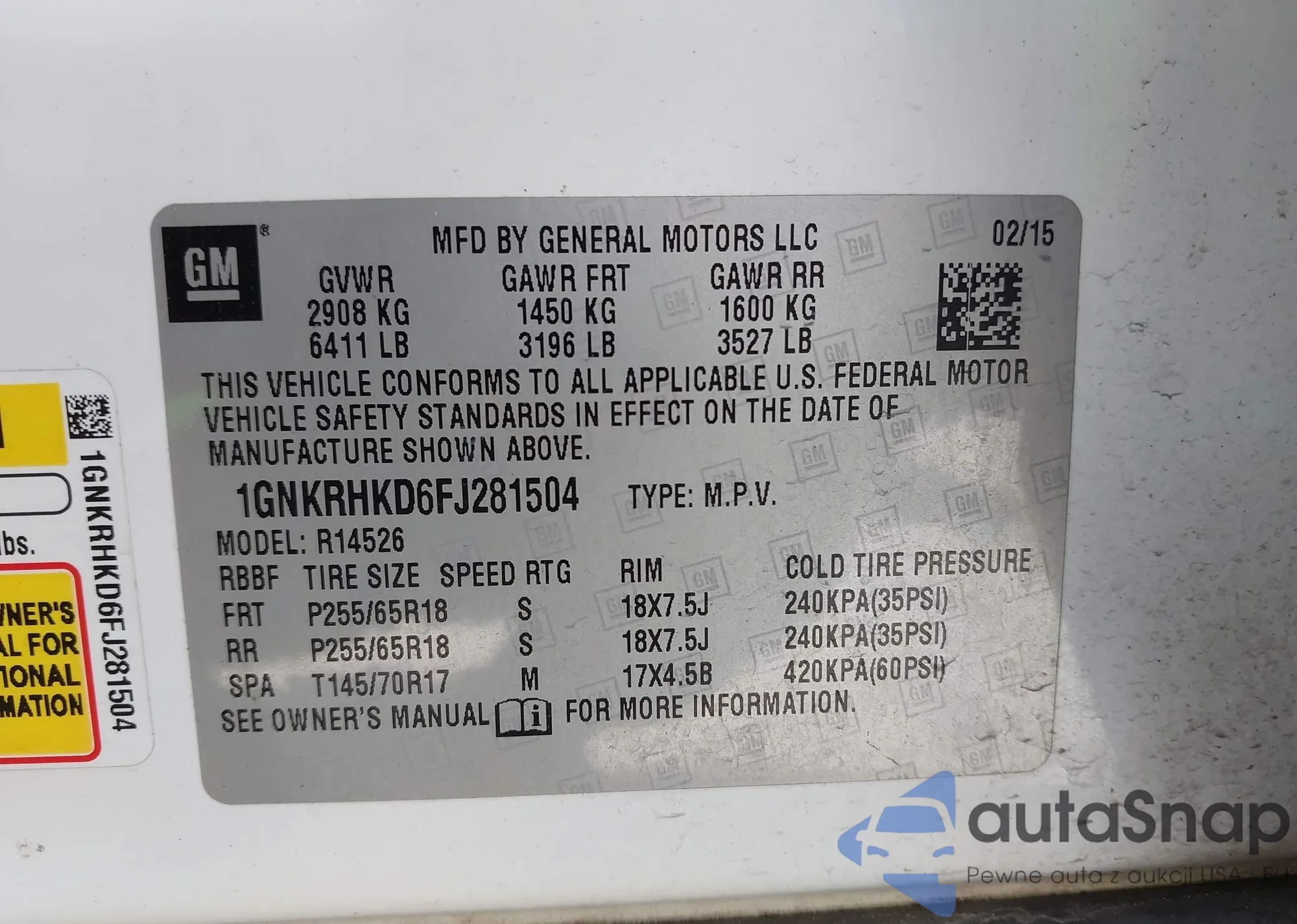 LOT: 42392261 VIN: 1GNKRHKD6FJ281504