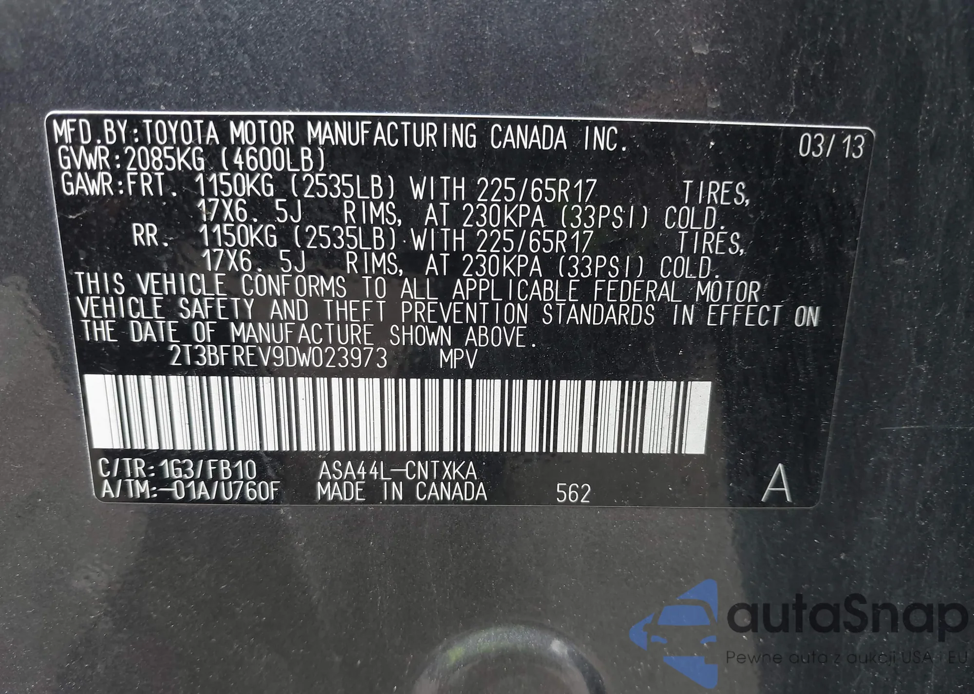 LOT: 42450510 VIN: 2T3BFREV9DW023973