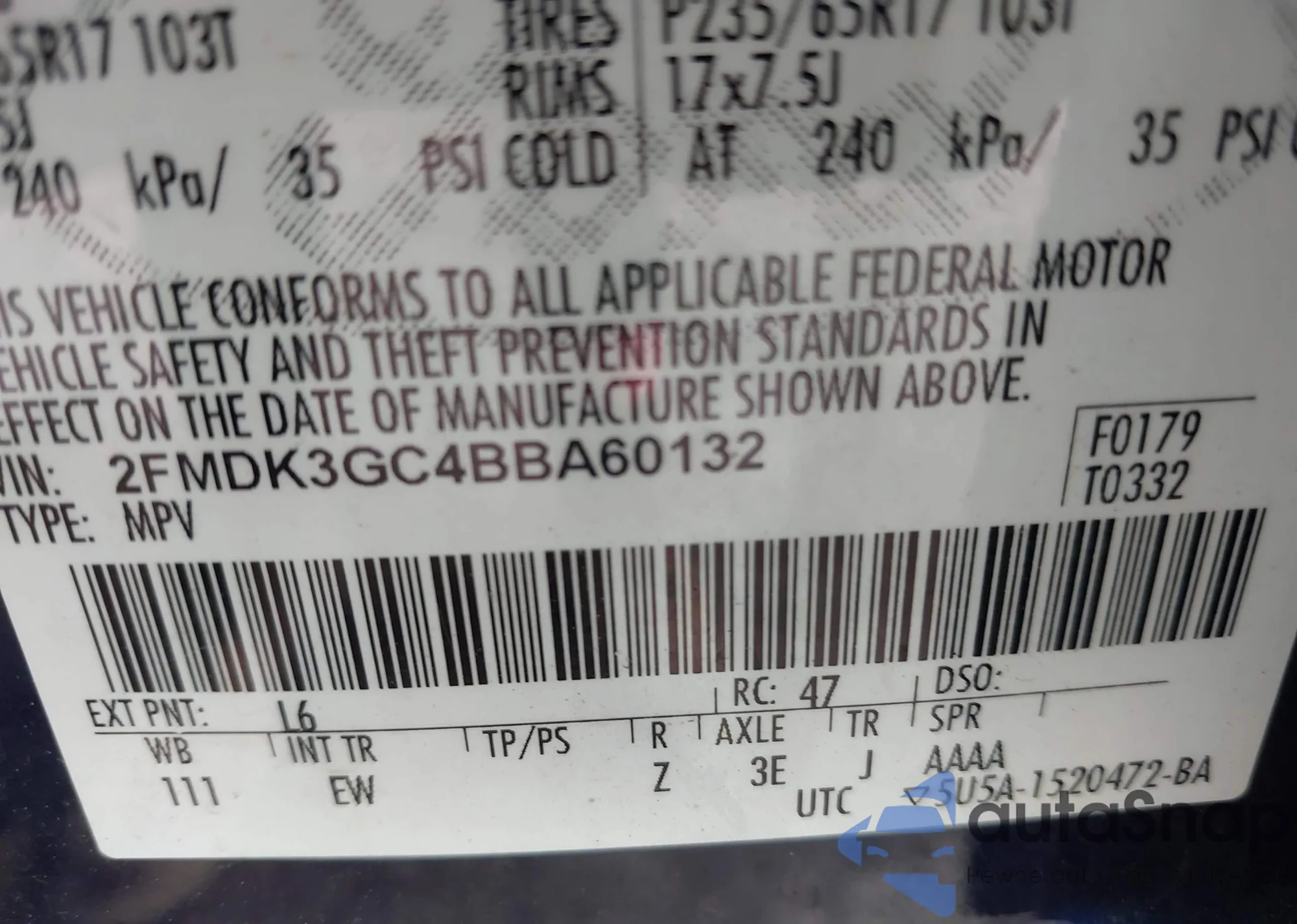 LOT: 42180574 VIN: 2FMDK3GC4BBA60132