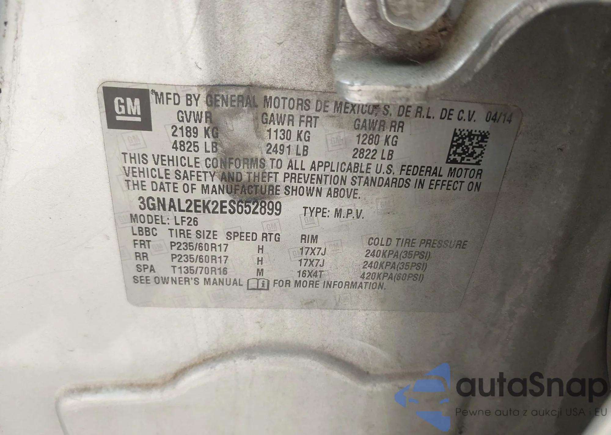 LOT: 42191815 VIN: 3GNAL2EK2ES652899