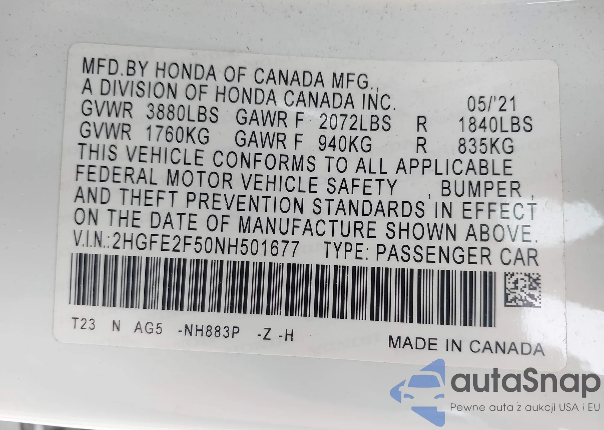 LOT: 42274341 VIN: 2HGFE2F50NH501677