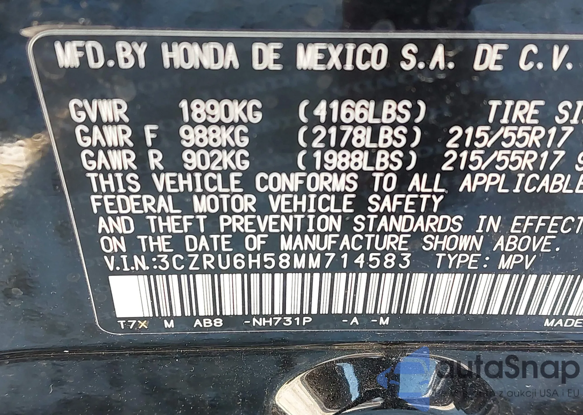 LOT: 42253517 VIN: 2HGFA16528H339593