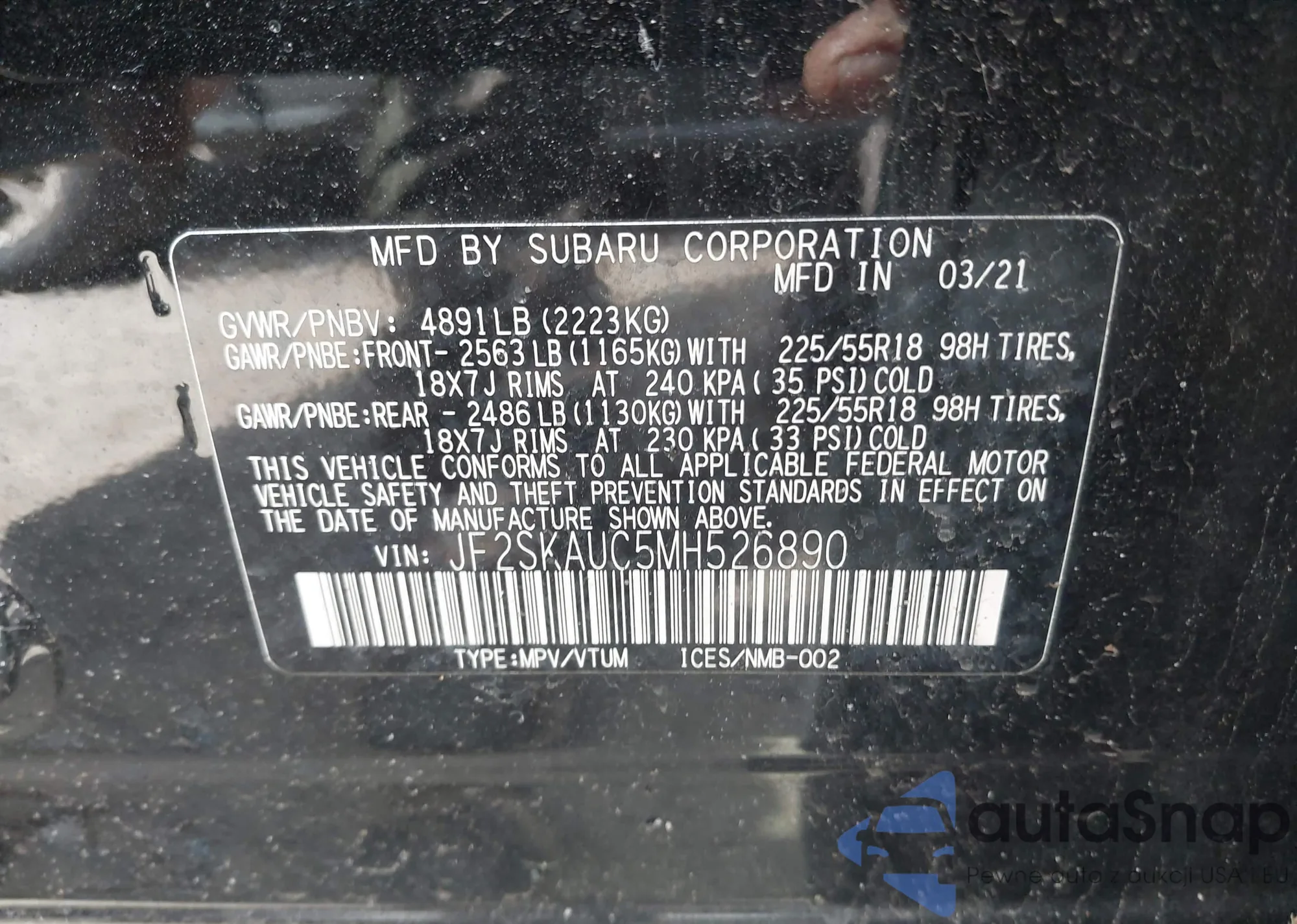 • VIN JF2SKAUC5MH526890