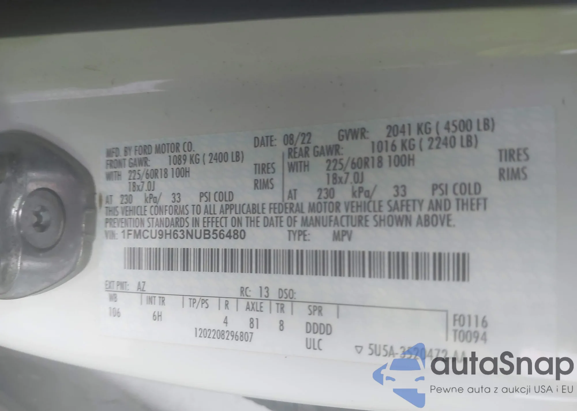 LOT: 42421381 VIN: 1FMCU9H63NUB56480