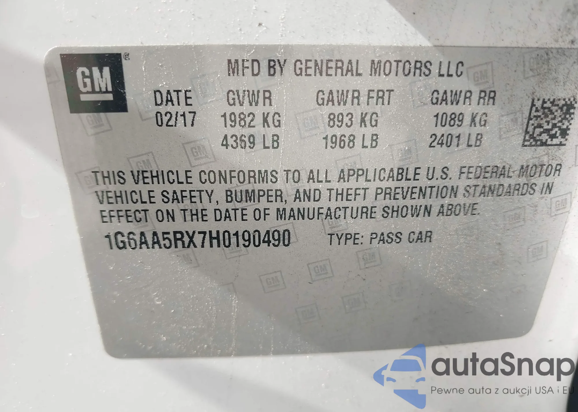 • VIN 1G6AA5RX7H0190490