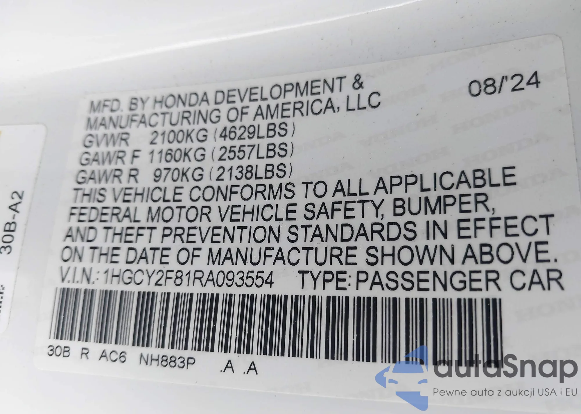 • VIN 1HGCY2F81RA093554