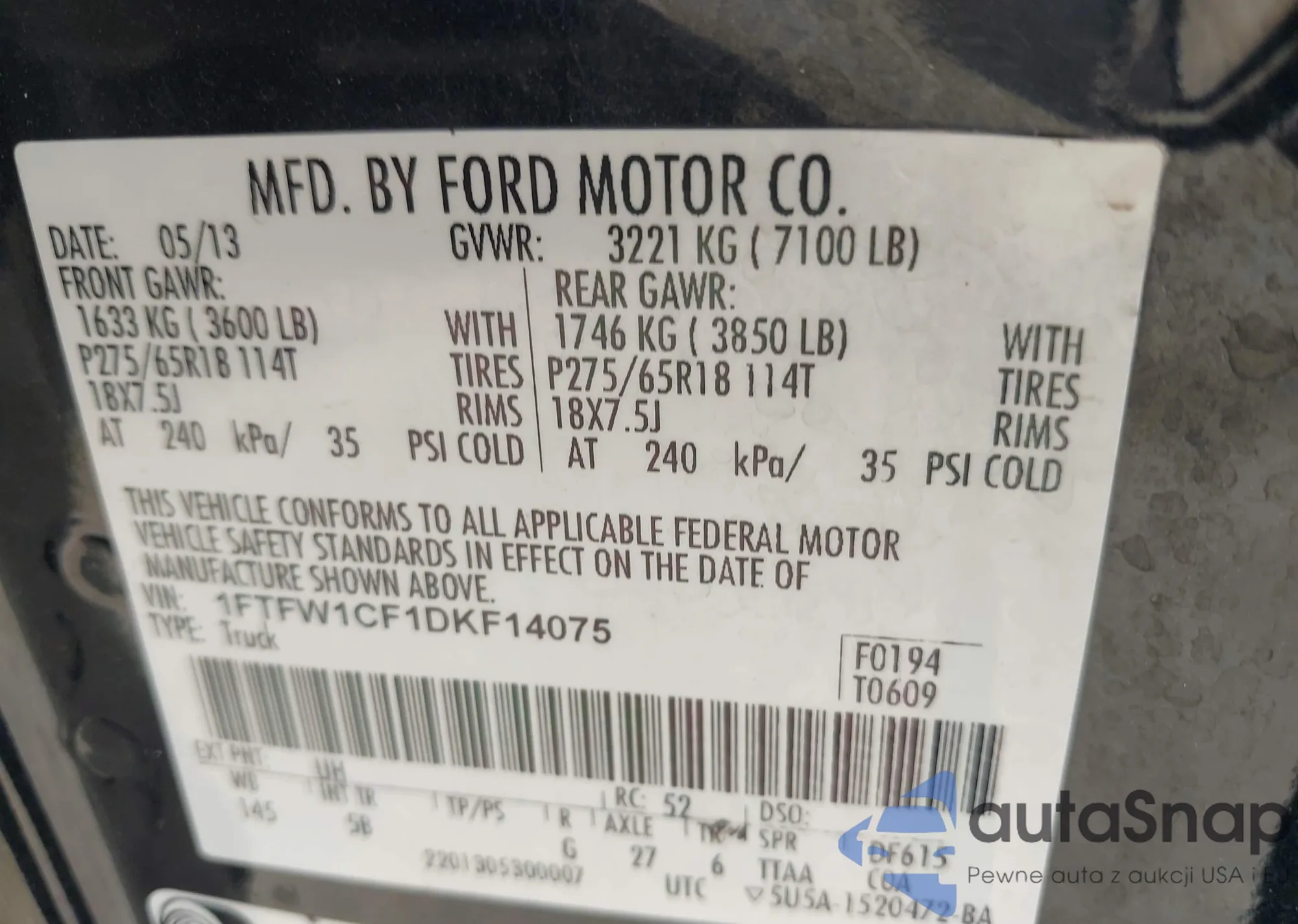LOT: 42520976 VIN: 1FTFW1CF1DKF14075