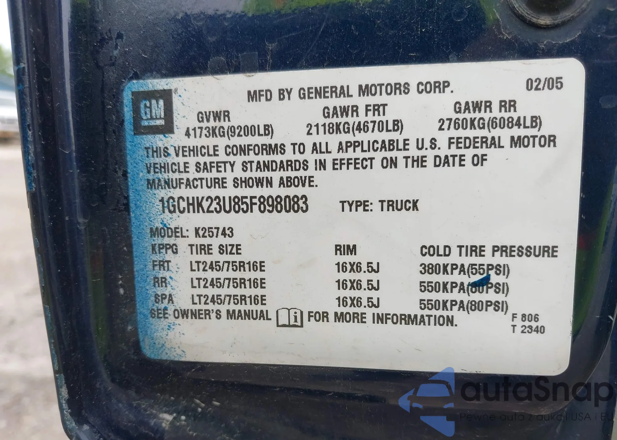 LOT: 42506950 VIN: 1GCHK23U85F898083