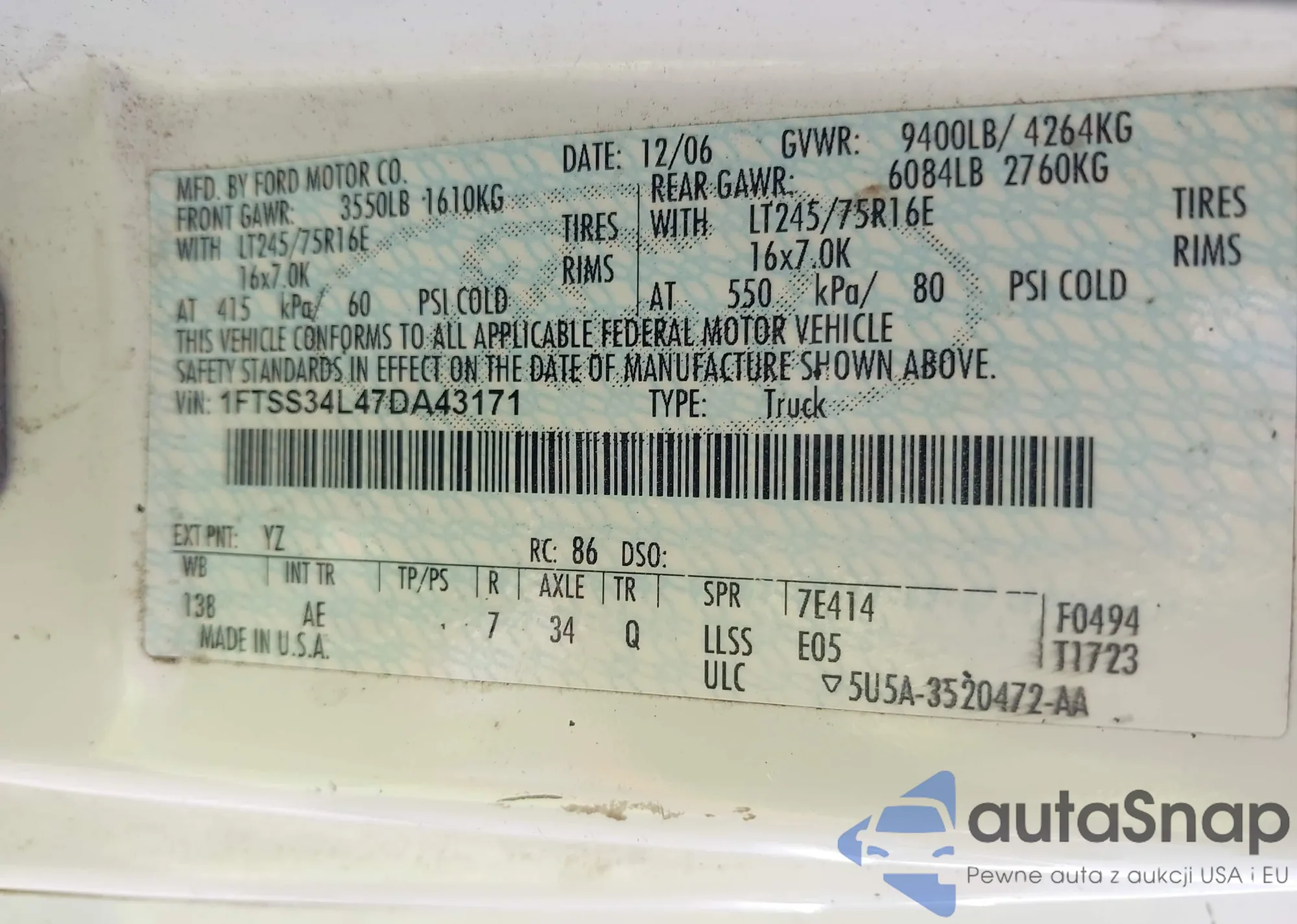 LOT: 42511304 VIN: 1FTSS34L47DA43171