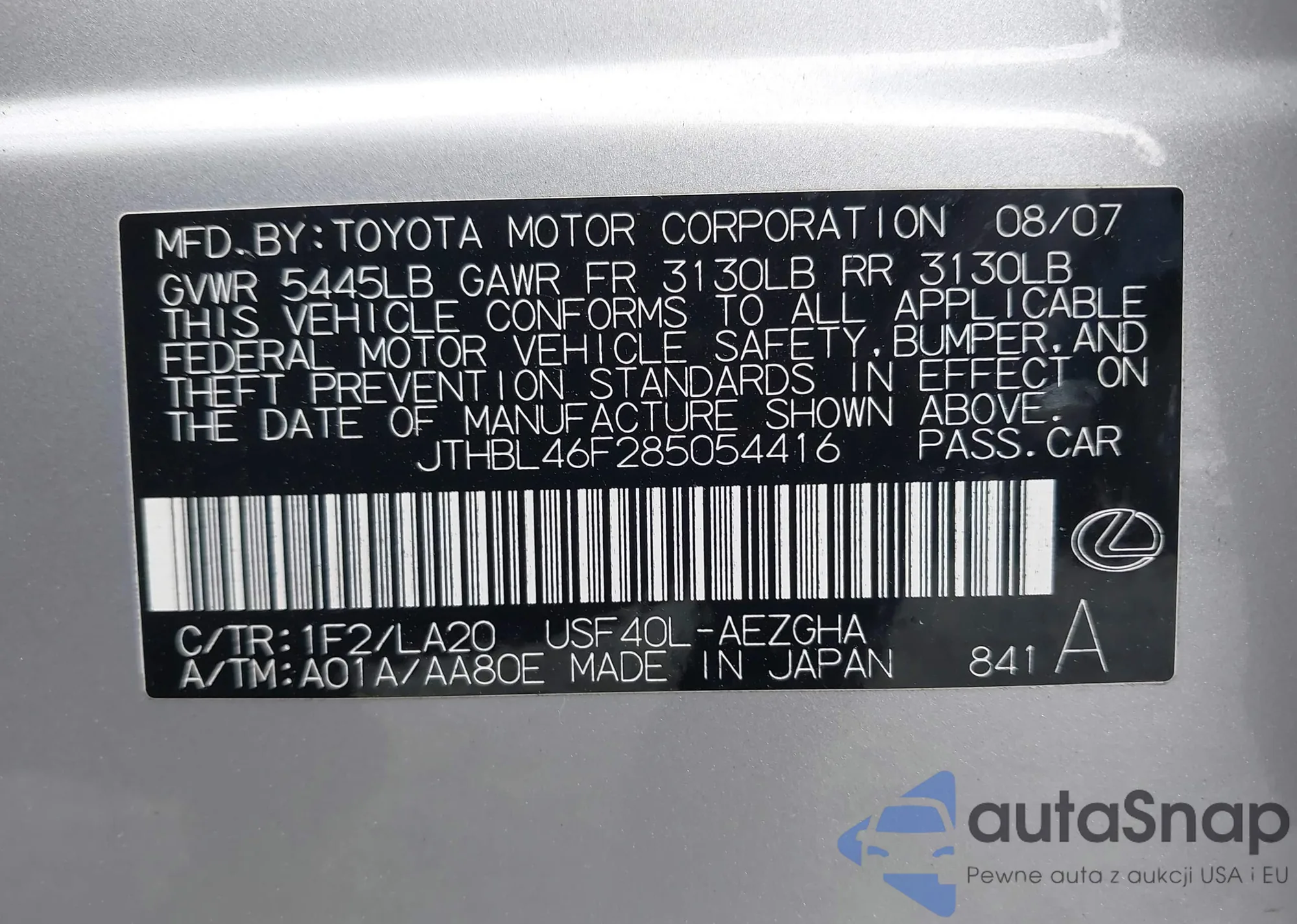 LOT: 42239100 VIN: JTHBL46F285054416