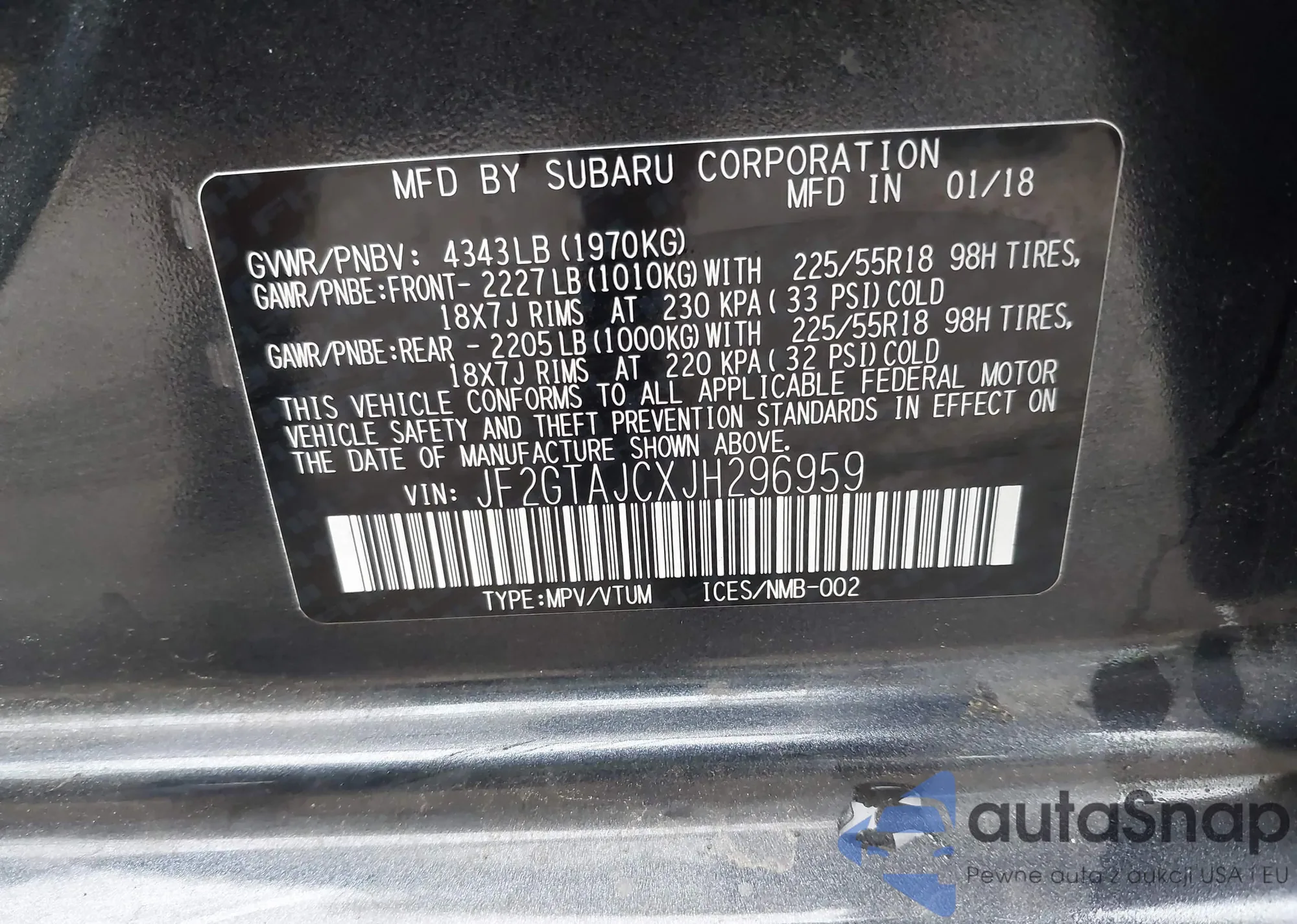 LOT: 42425926 VIN: JF2GTAJCXJH296959