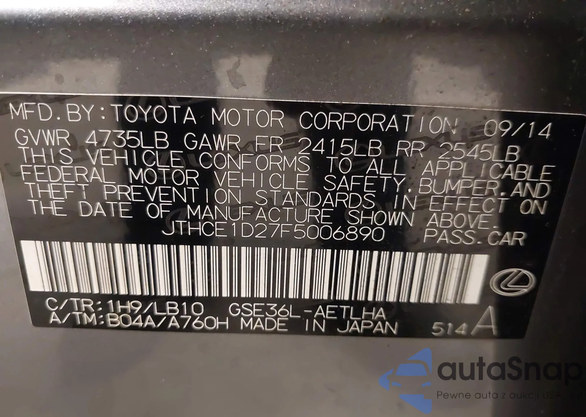 LOT: 42449096 VIN: JTHCE1D27F5006890