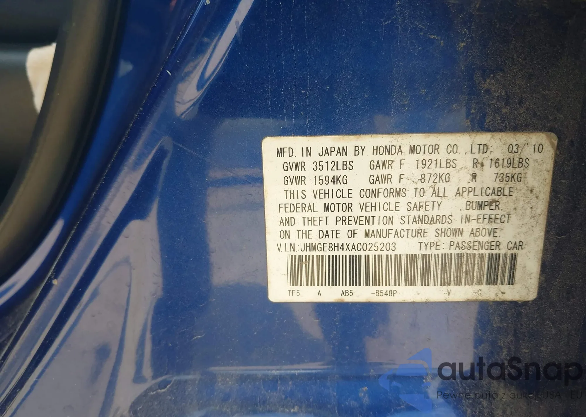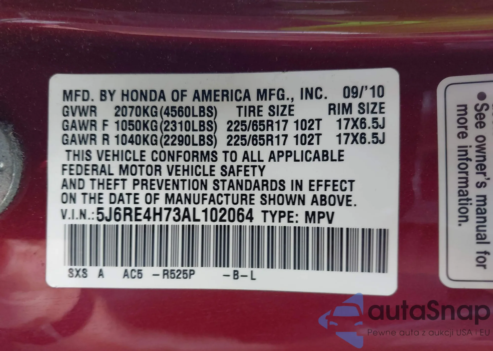 • VIN 5J6RE4H73AL102064