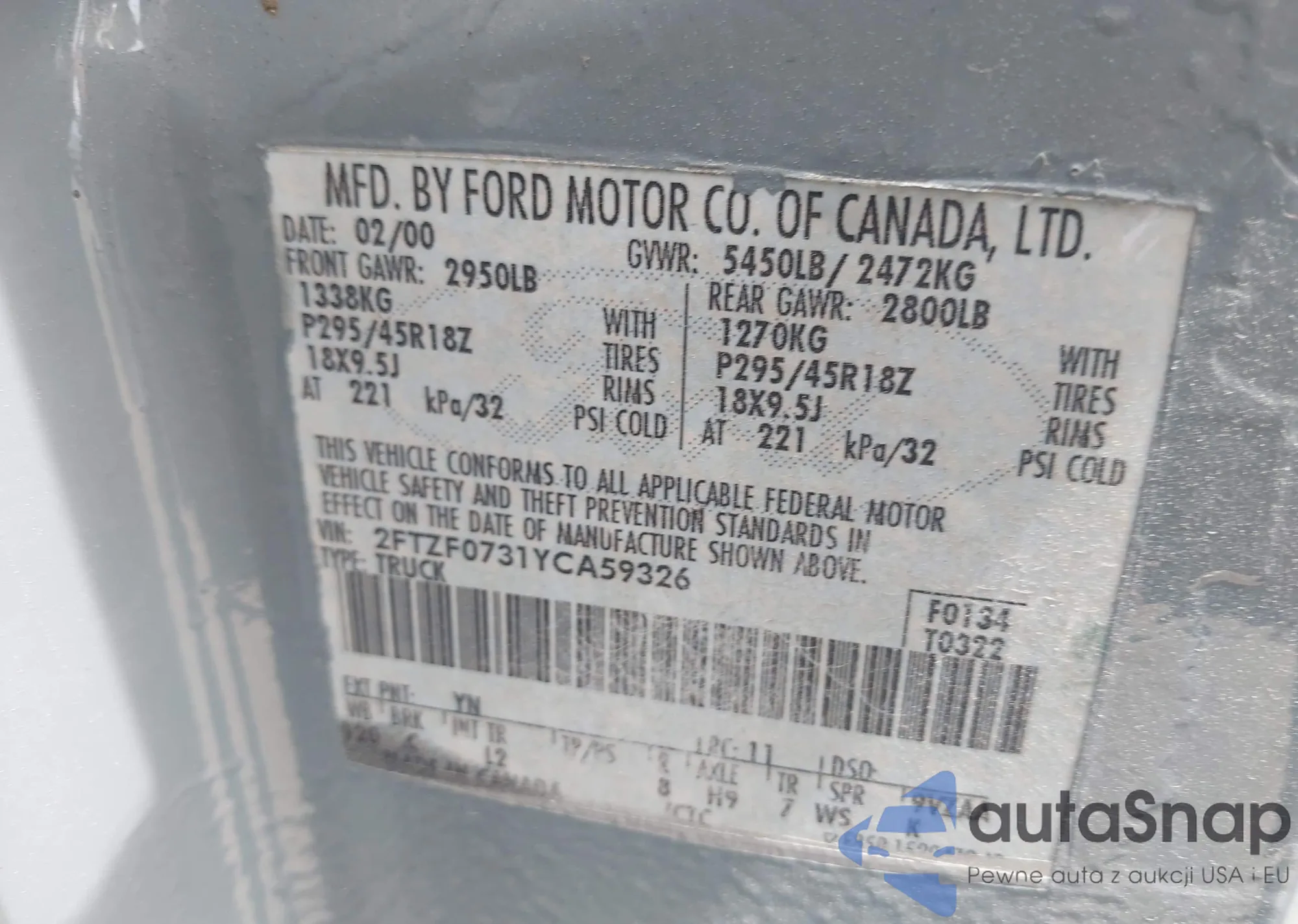 LOT: 42337424 VIN: 2FTZF0731YCA59326