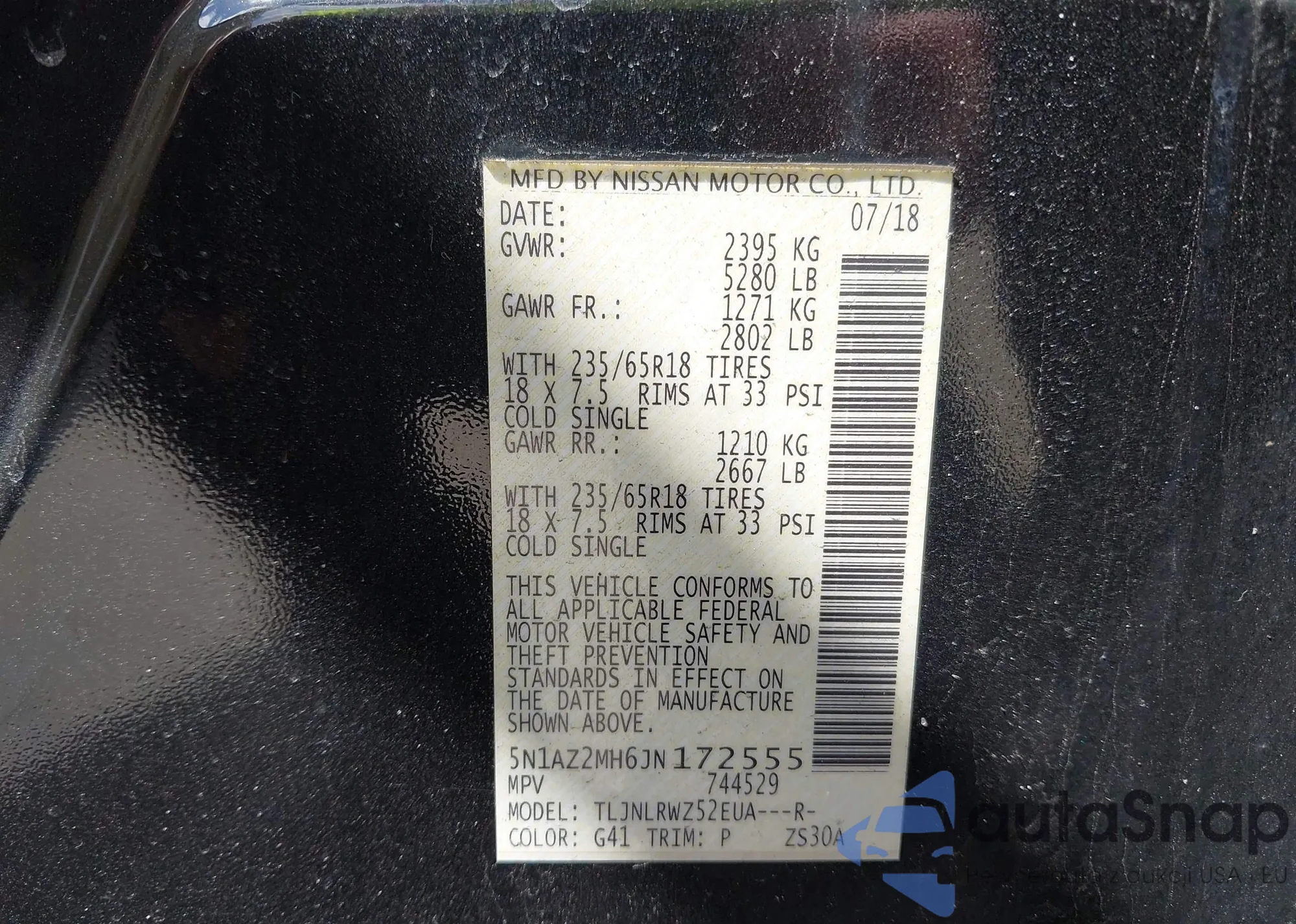 LOT: 42180105 VIN: 5N1AZ2MH6JN172555