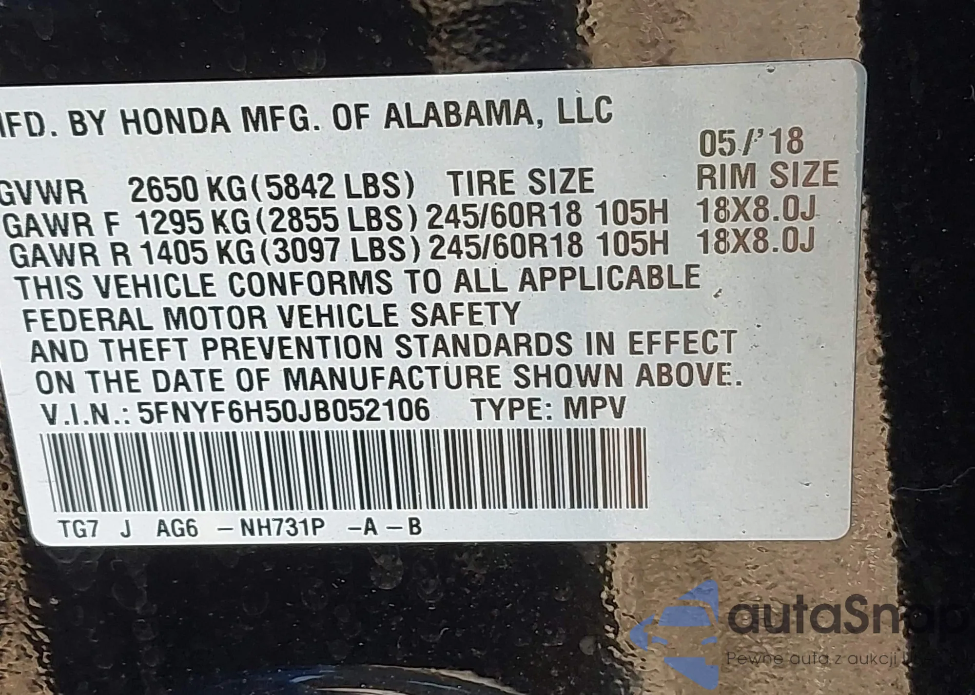 LOT: 42202167 VIN: 5FNYF6H50JB052106