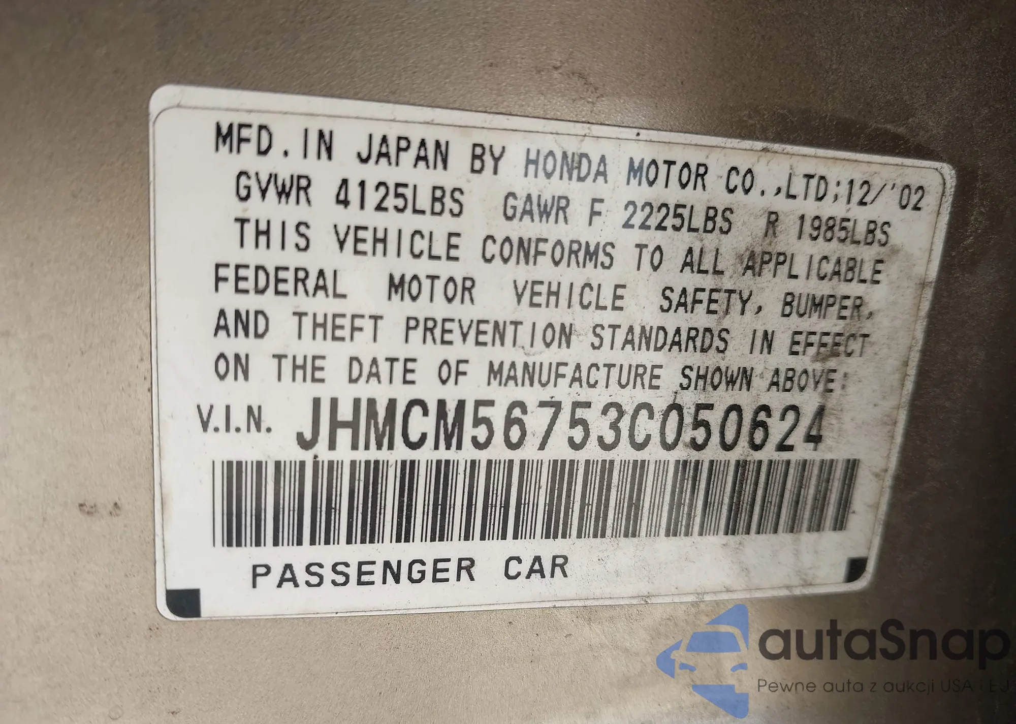 LOT: 42386085 VIN: JHMCM56753C050624