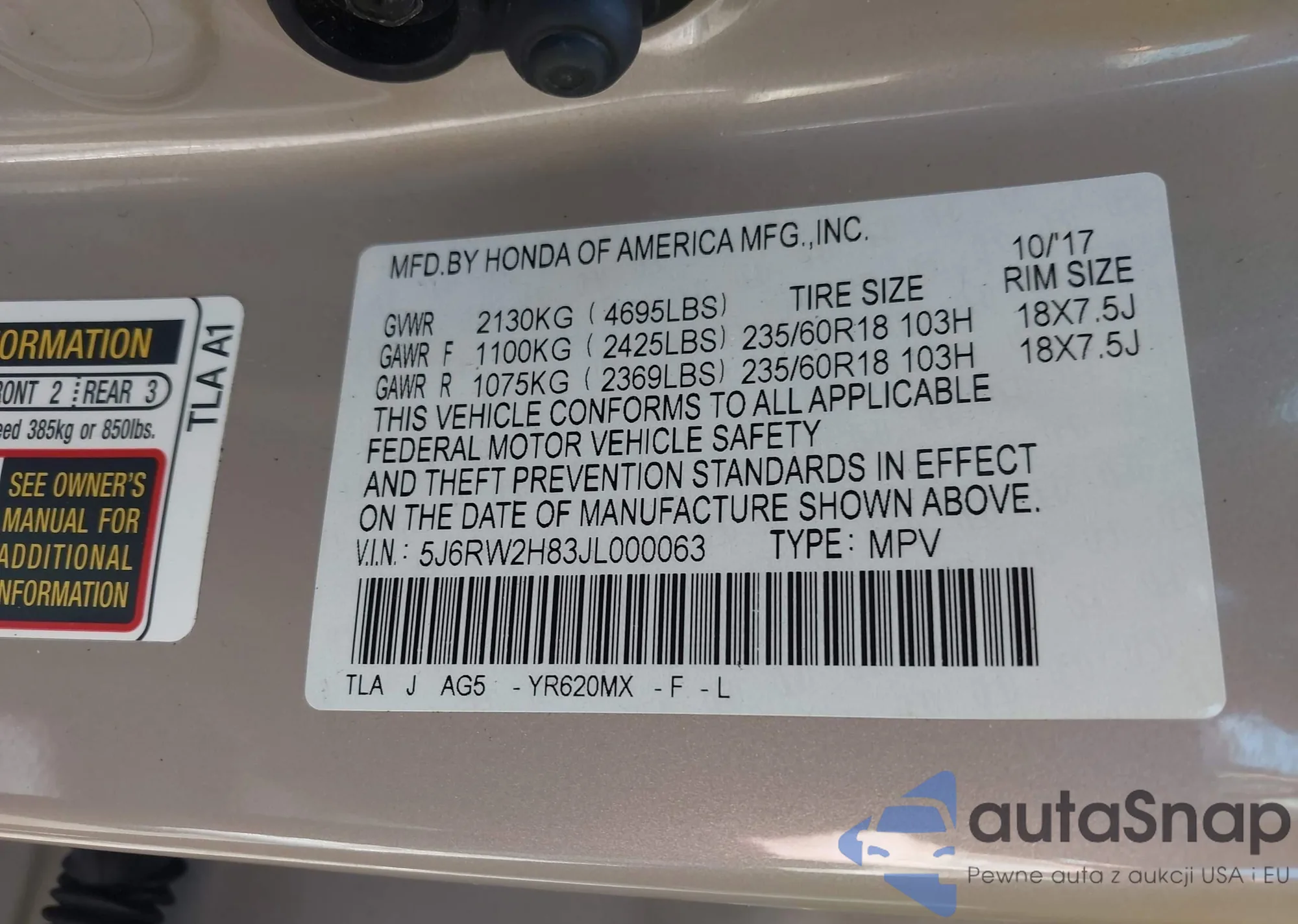 • VIN 5J6RW2H58LL001900