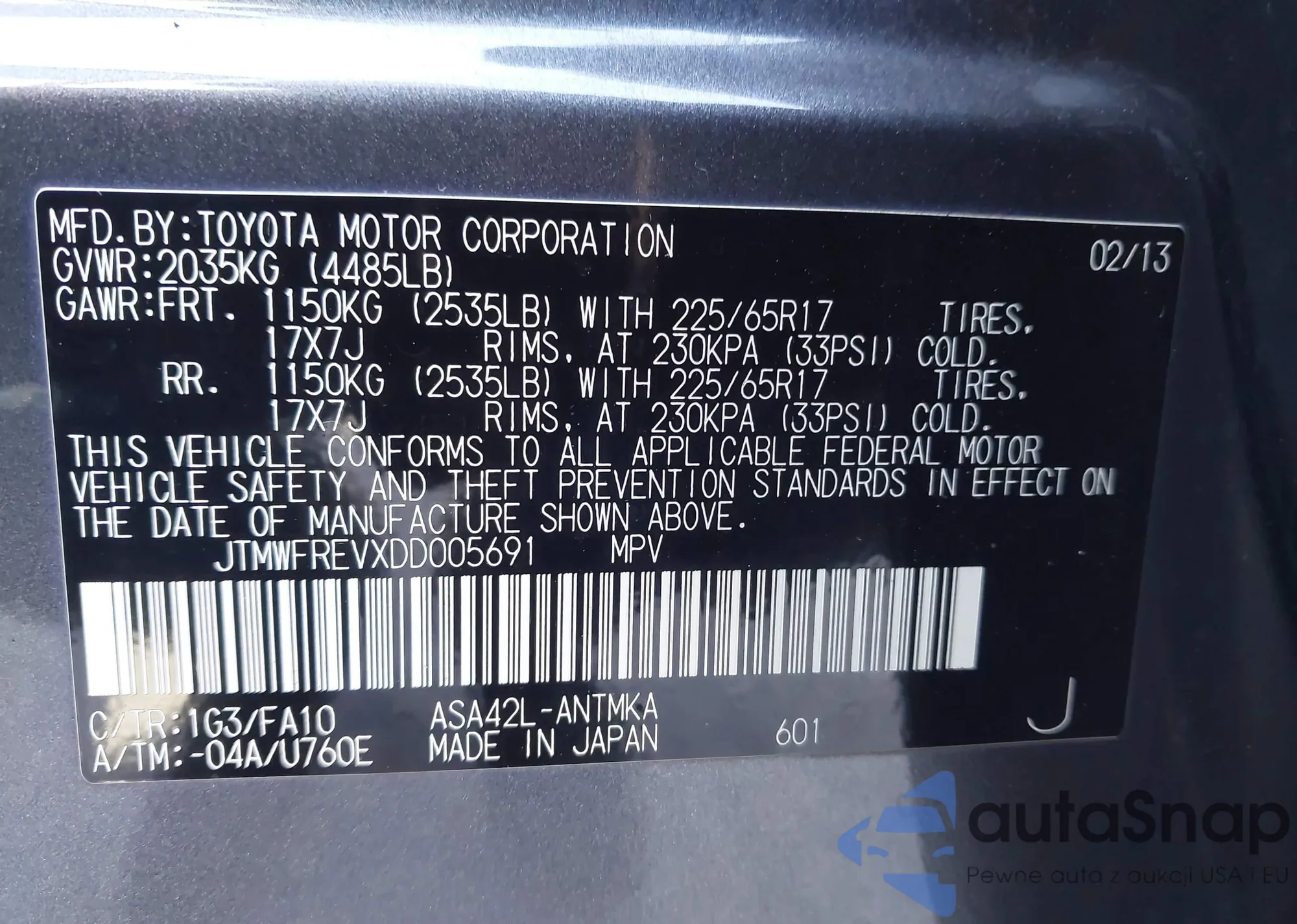 LOT: 42377134 VIN: JTMWFREVXDD005691