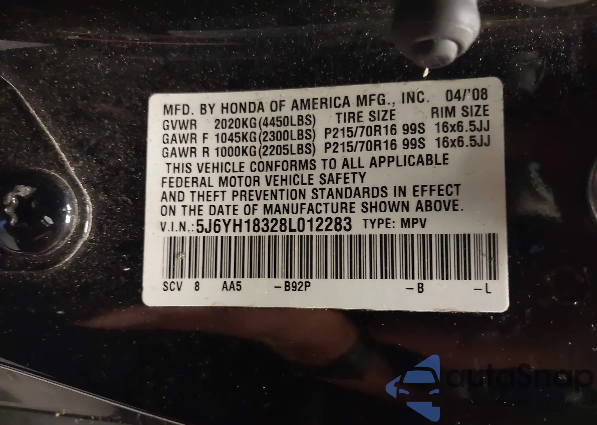 LOT: 42506730 VIN: 5J6YH18328L012283