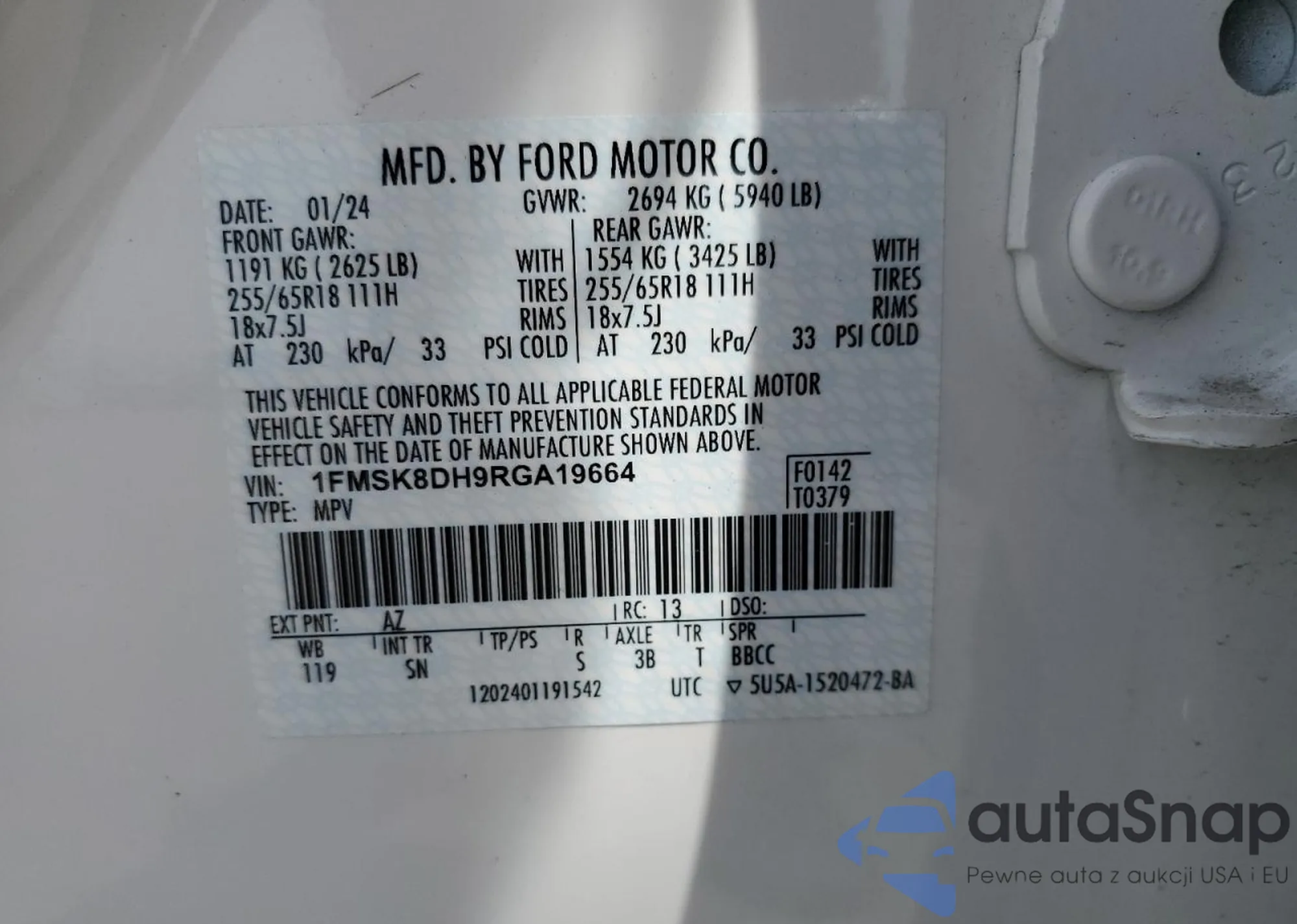 LOT: 58296695 VIN: 1FMSK8DH9RGA19664