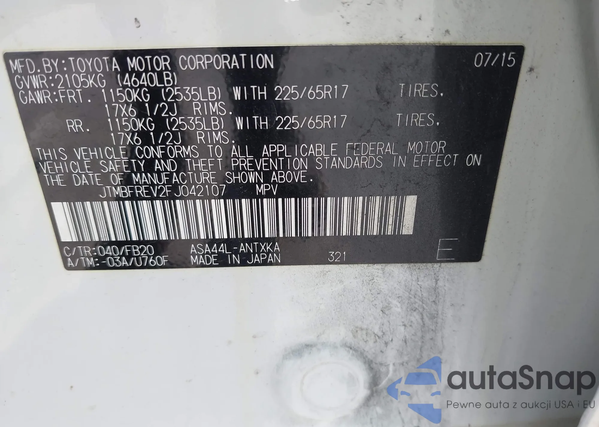 LOT: 42291565 VIN: JTMBFREV2FJ042107