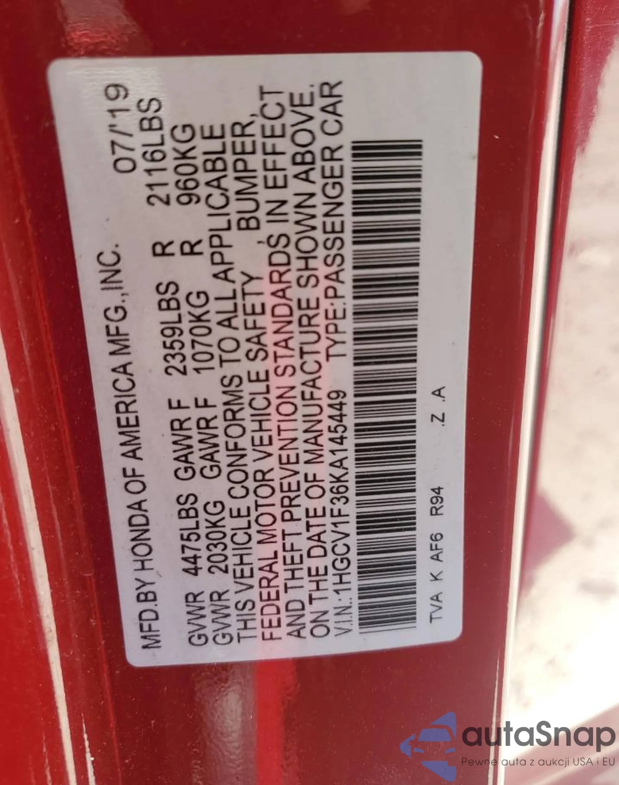 • VIN 1HGCV1F36KA145449