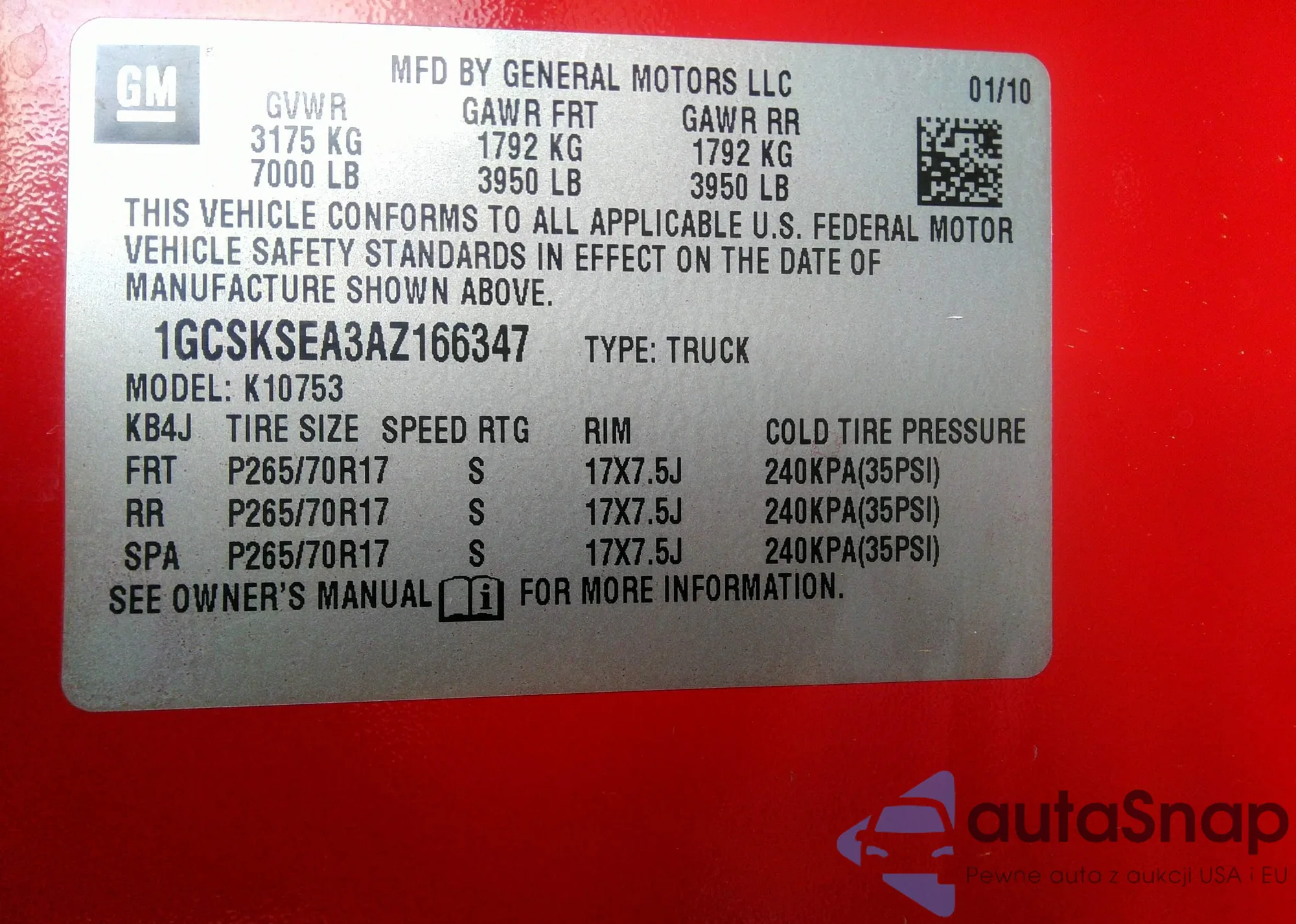LOT: 42307431 VIN: 1GCSKSEA3AZ166347