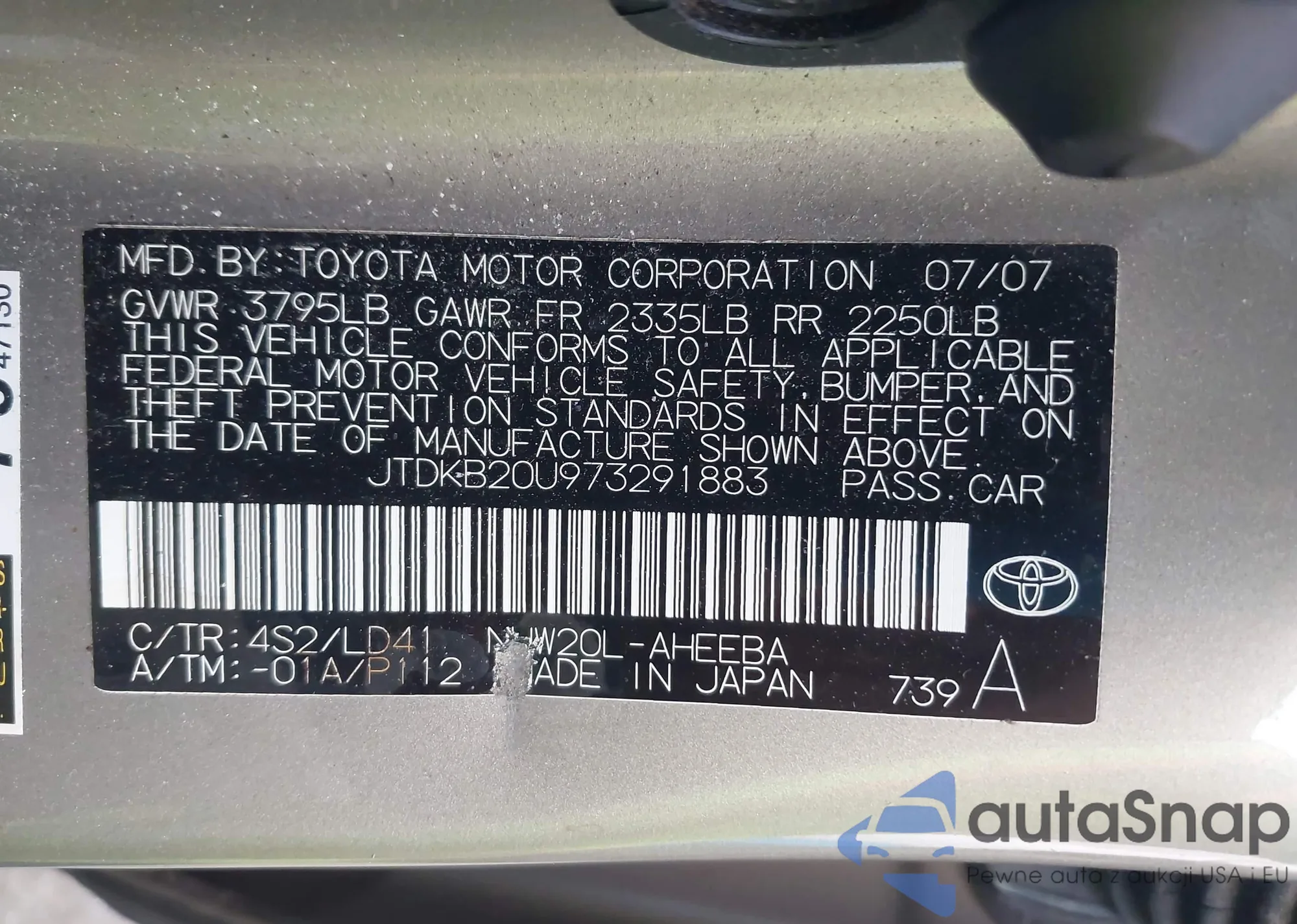 LOT: 42313635 VIN: JTDKB20U973291883