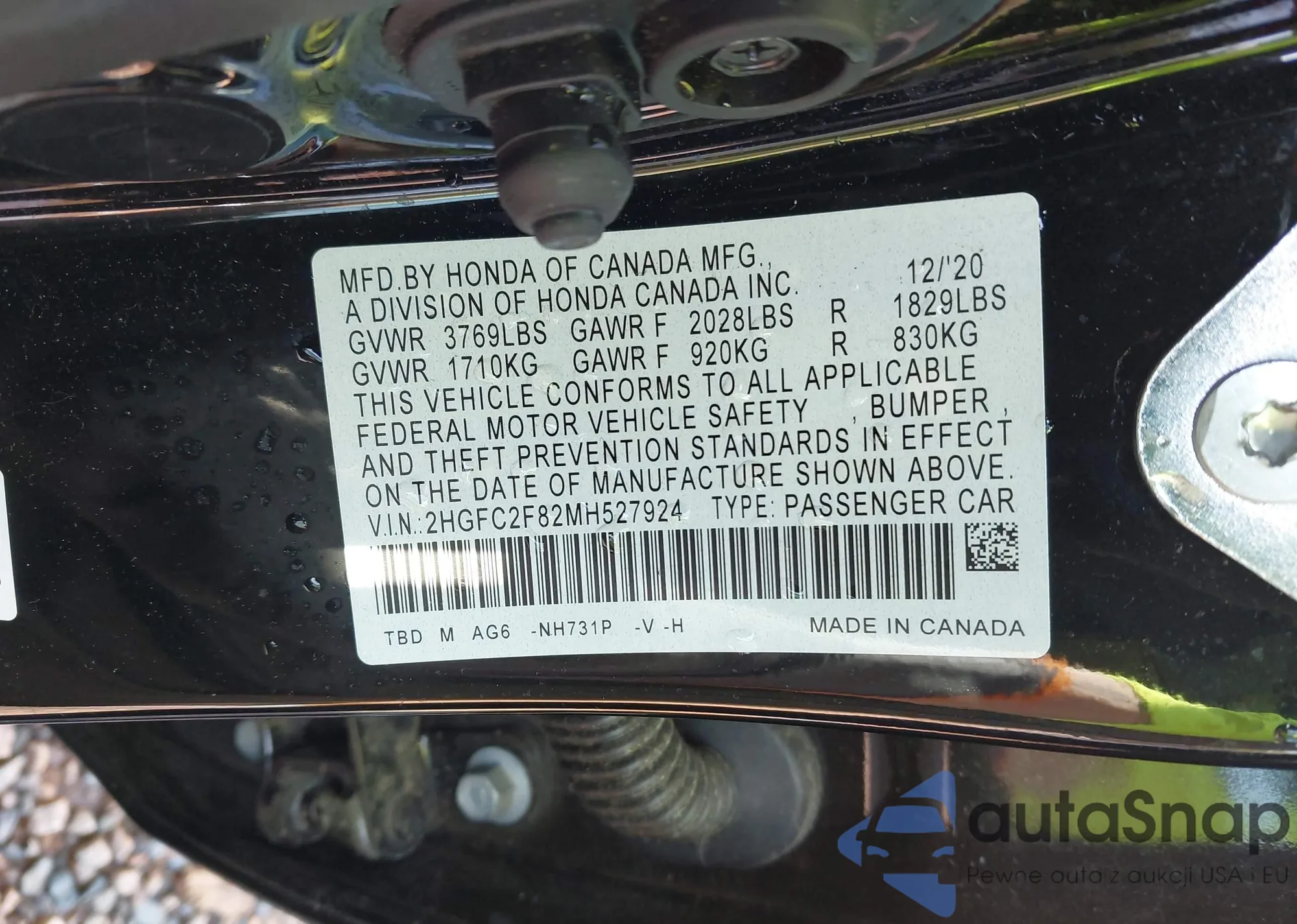 • VIN 2HGFC2F82MH527924