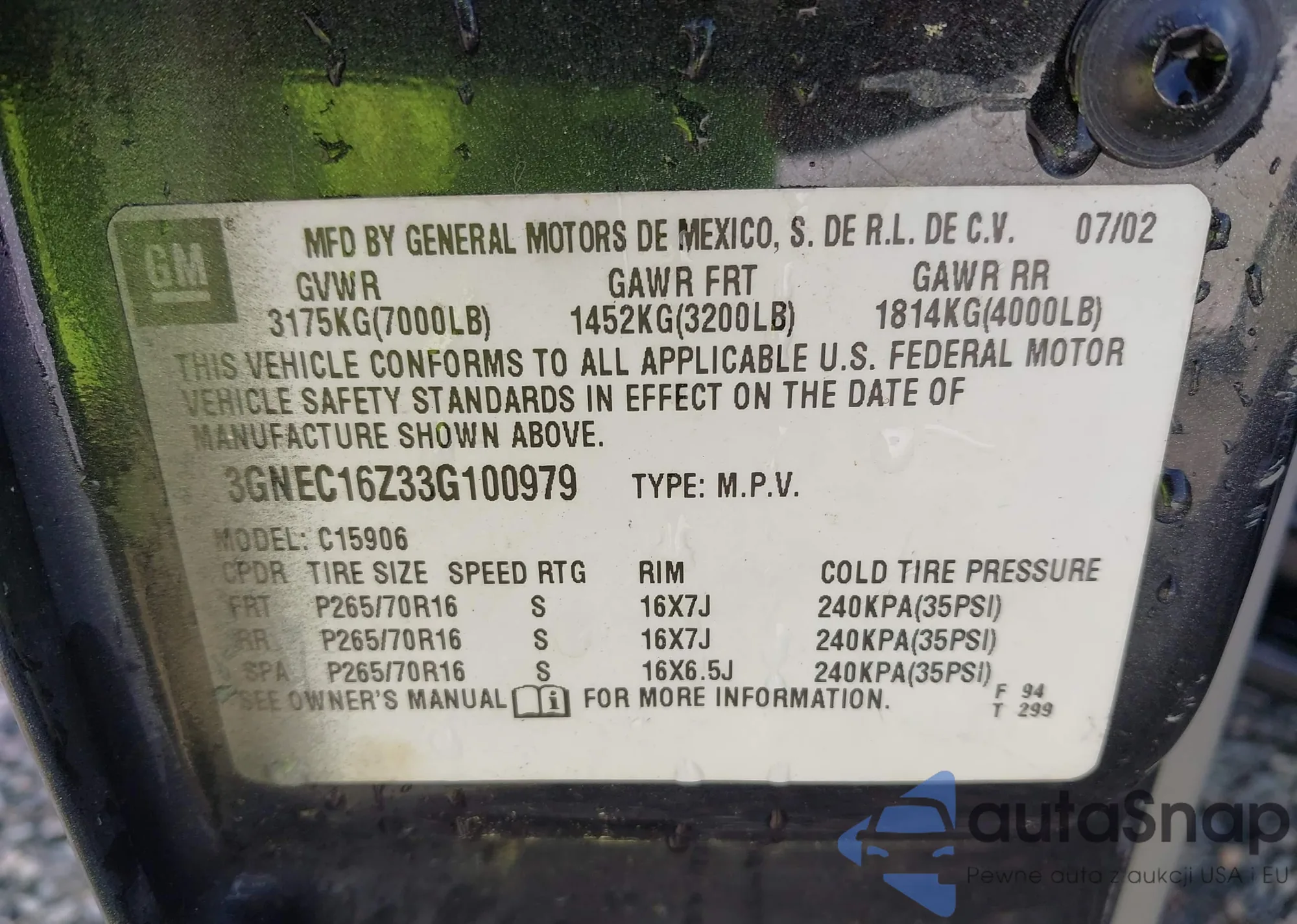 • VIN 3GNEC16Z33G100979
