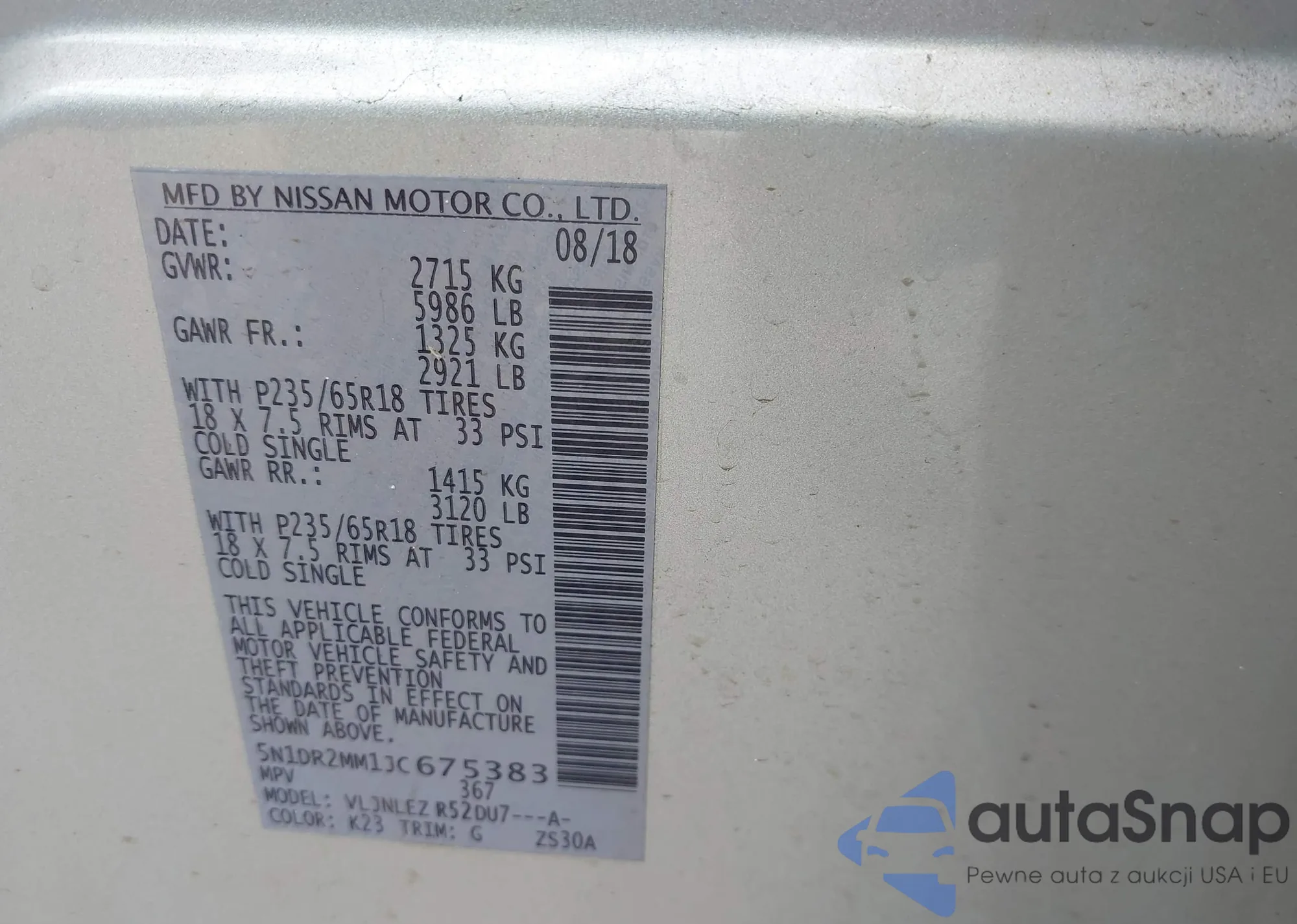 LOT: 41412784 VIN: 5N1DR2MM1JC675383