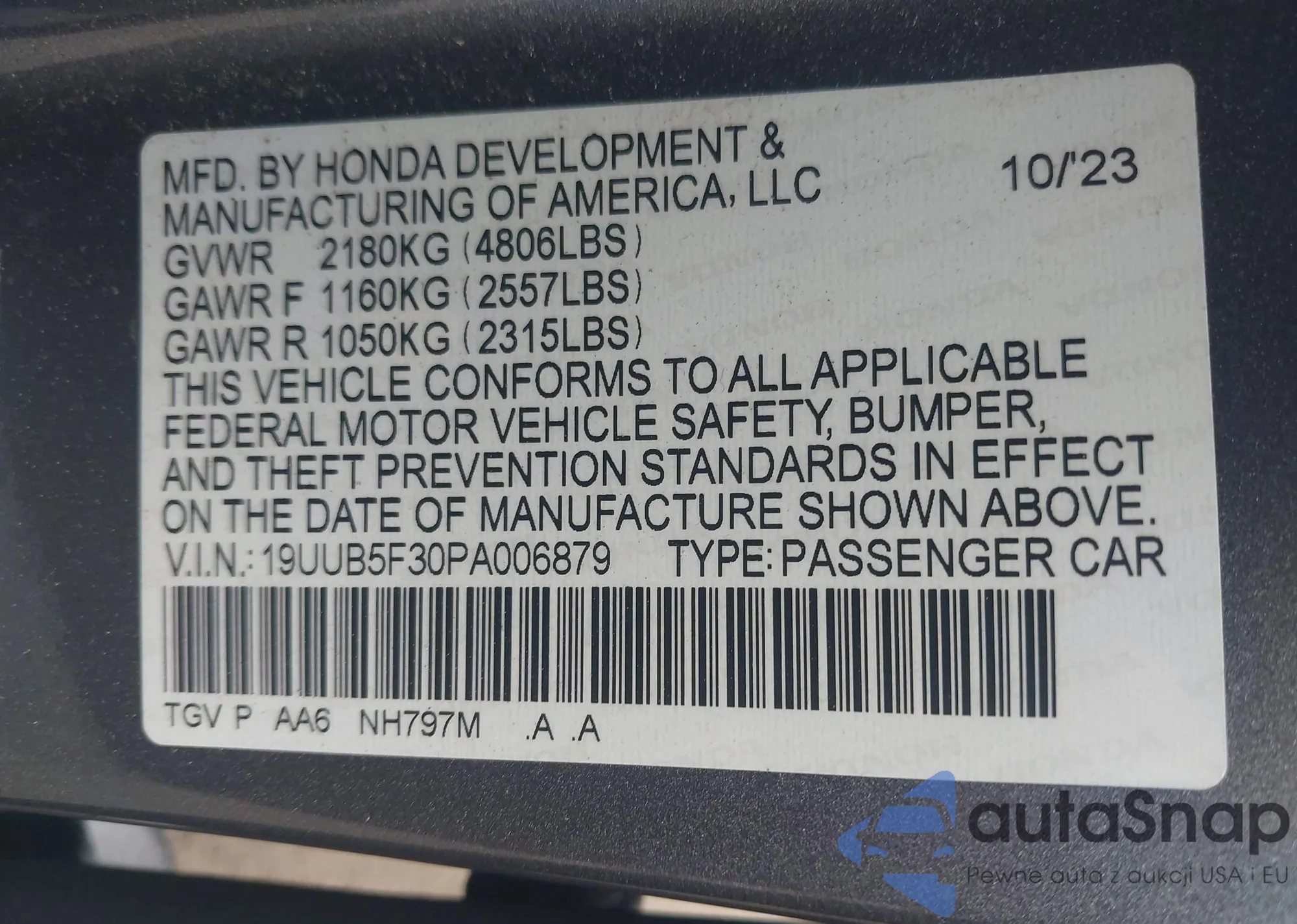 LOT: 42006899 VIN: 19UUB5F30PA006879