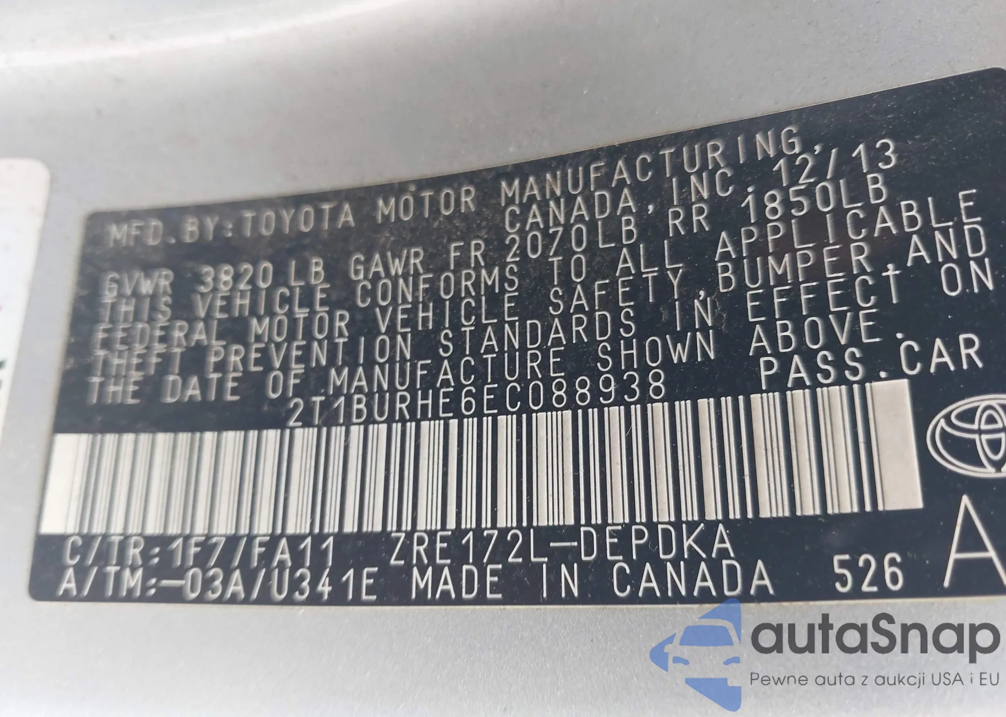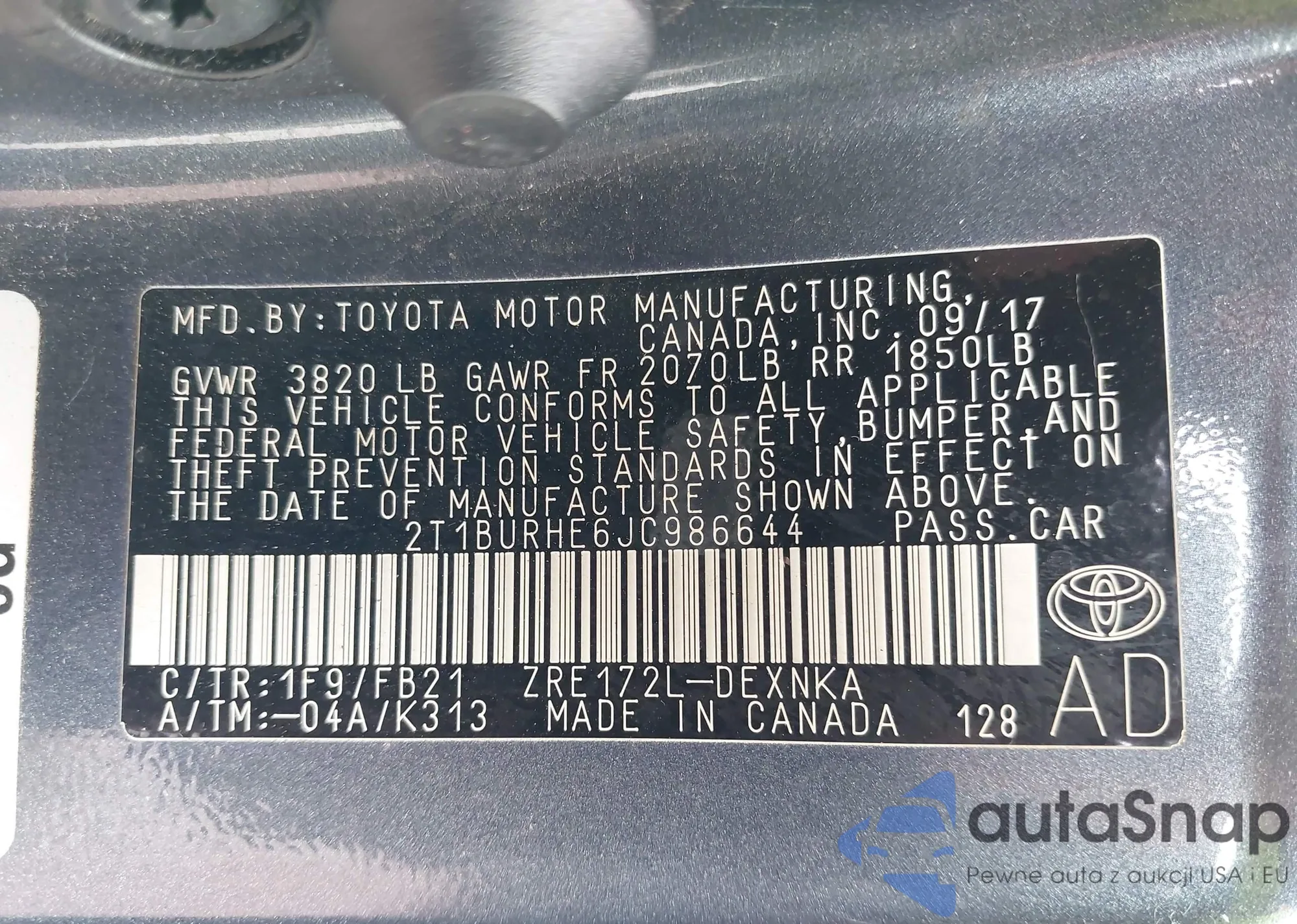 LOT: 42211600 VIN: 2T1BURHE6JC986644