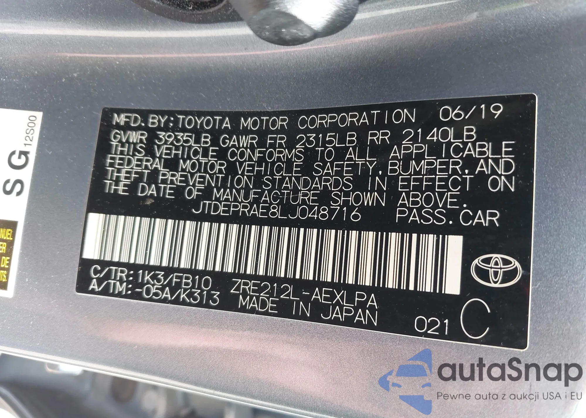 LOT: 42245483 VIN: JTDEPRAE8LJ048716