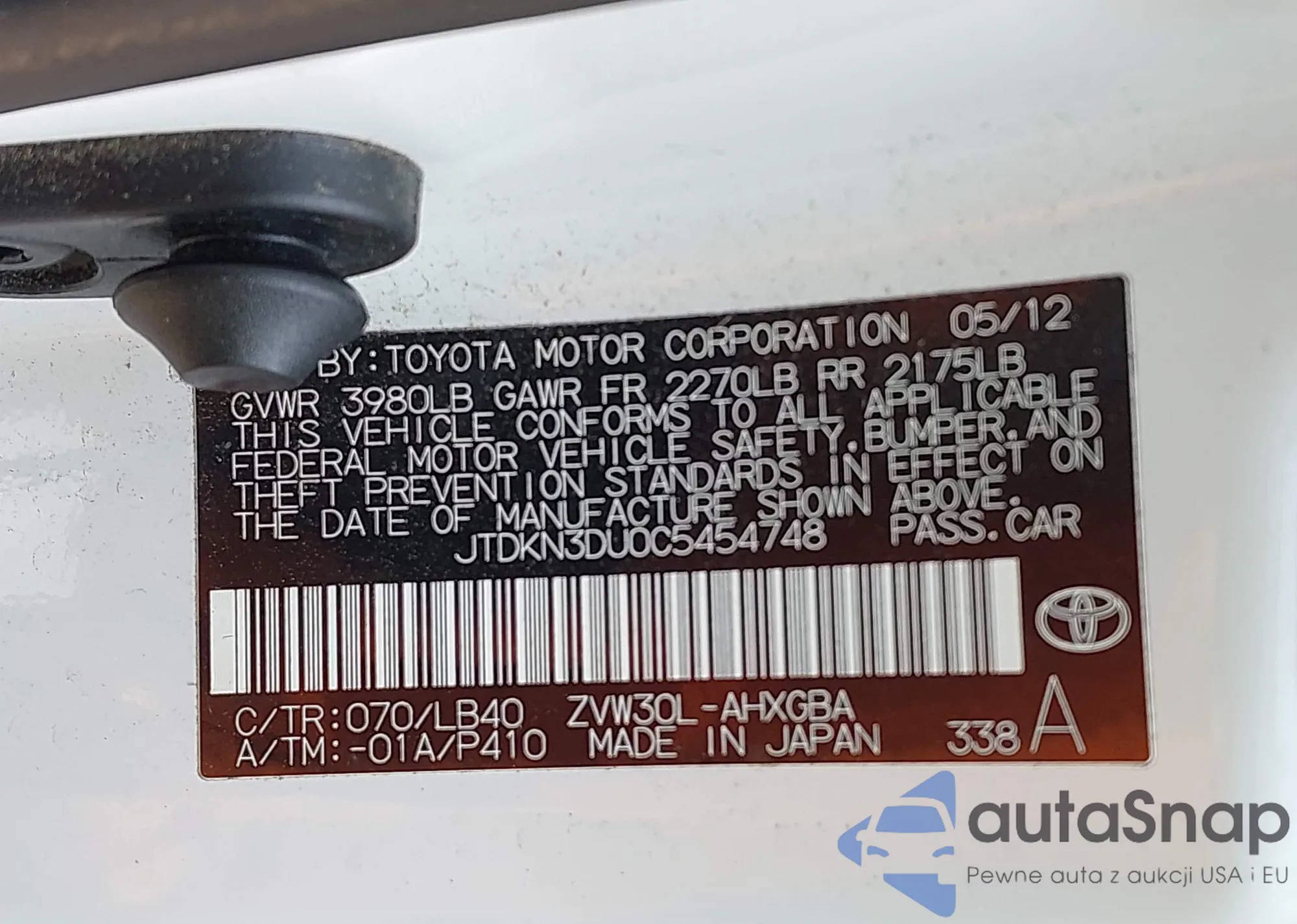 LOT: 42278928 VIN: JTDKN3DU0C5454748