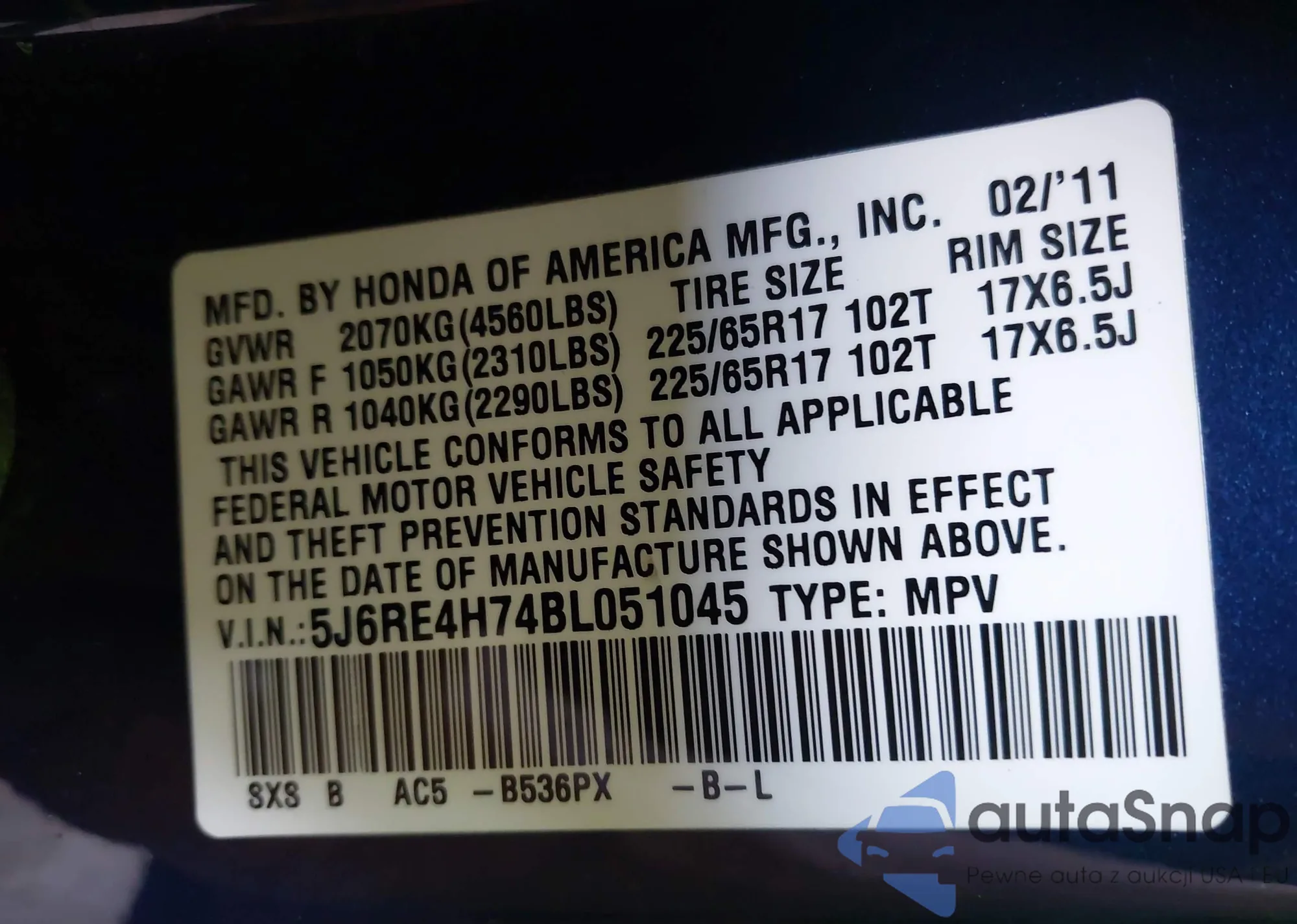 • VIN 5J6RE4H74BL051045