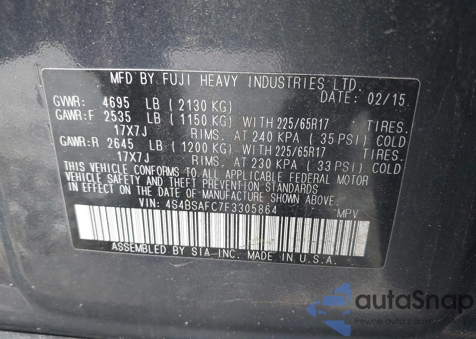 • VIN 4S4BSAFC7F3305864