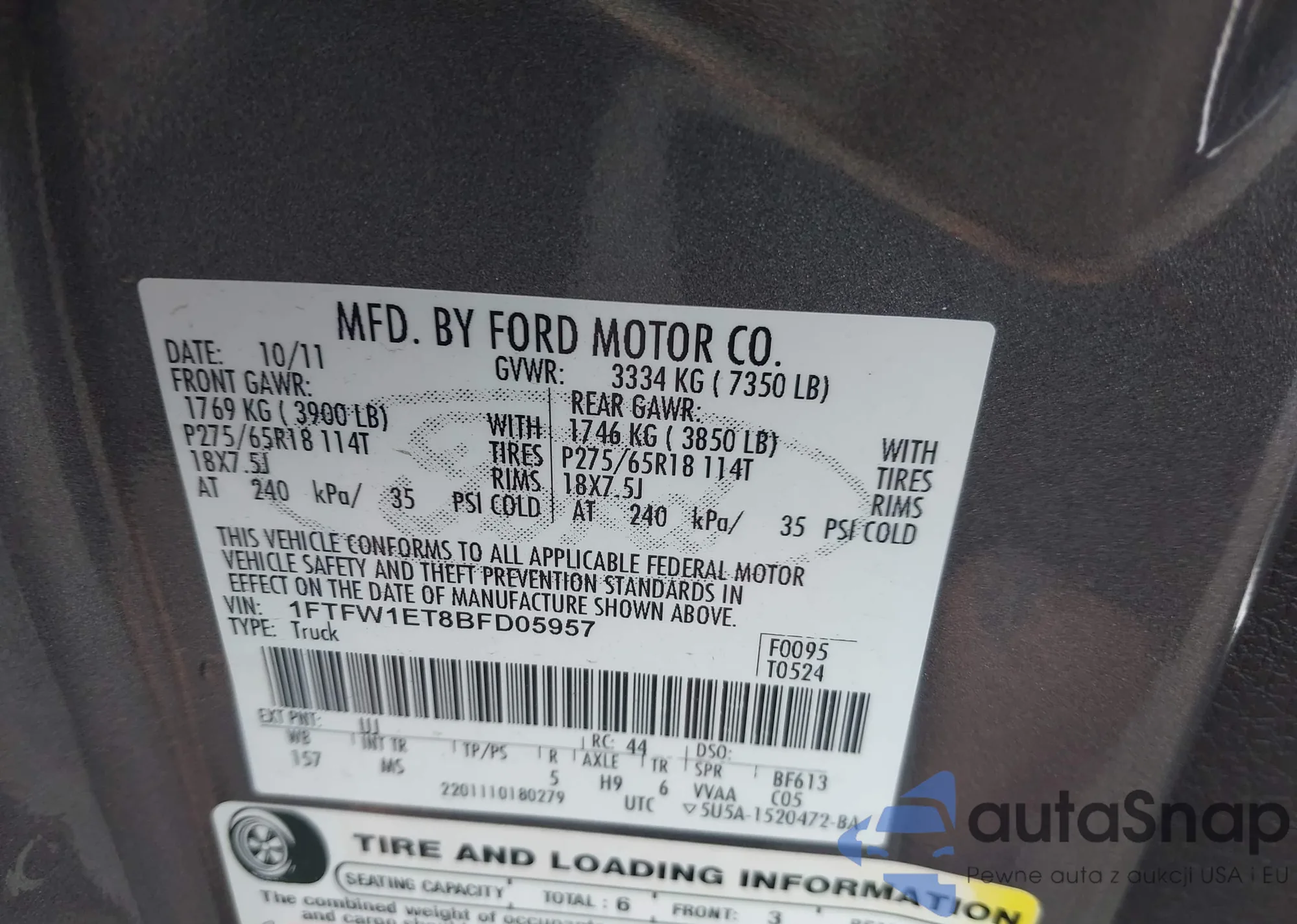 LOT: 42511809 VIN: 1FTFW1ET8BFD05957