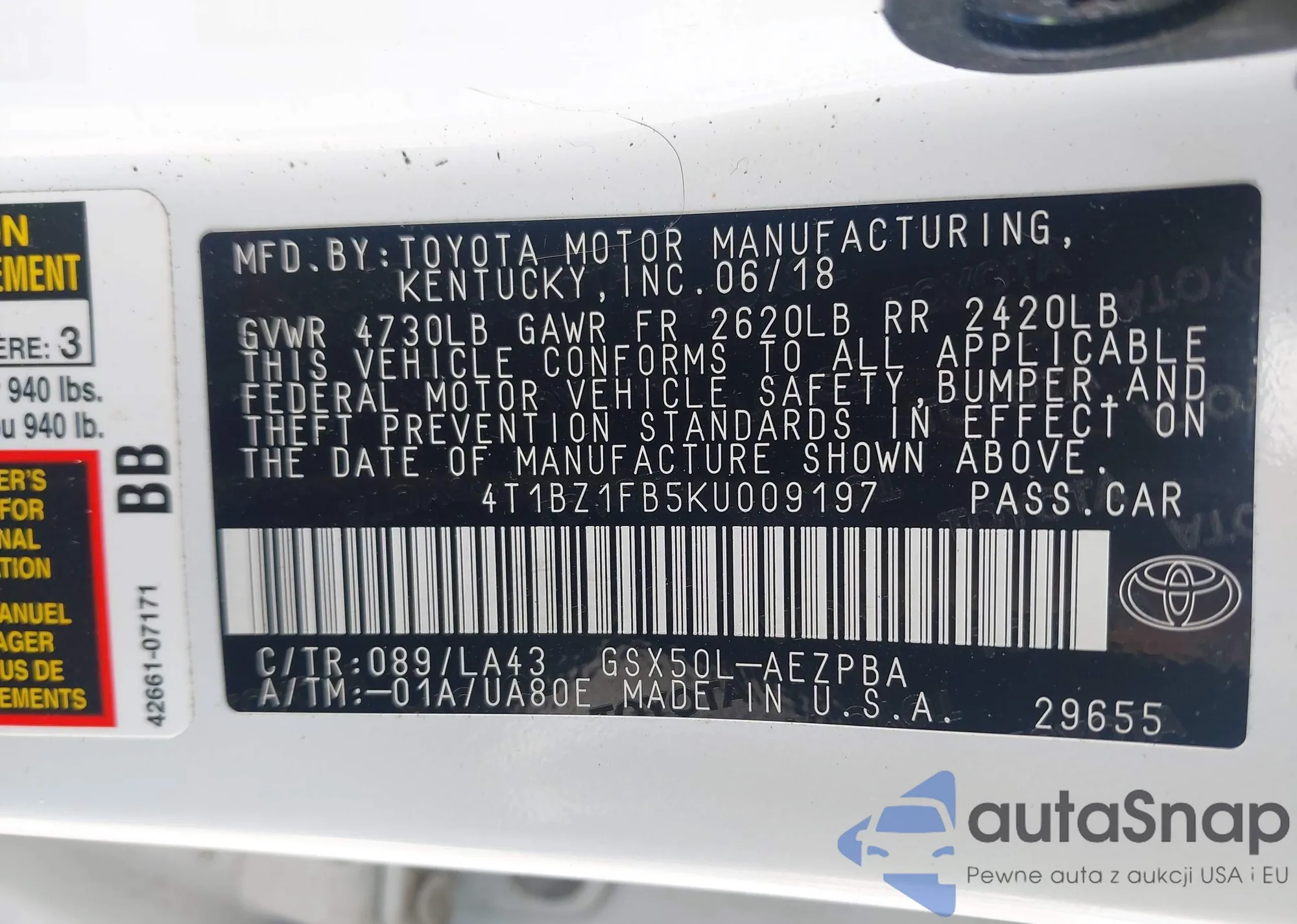 • VIN 4T1BZ1FB5KU009197