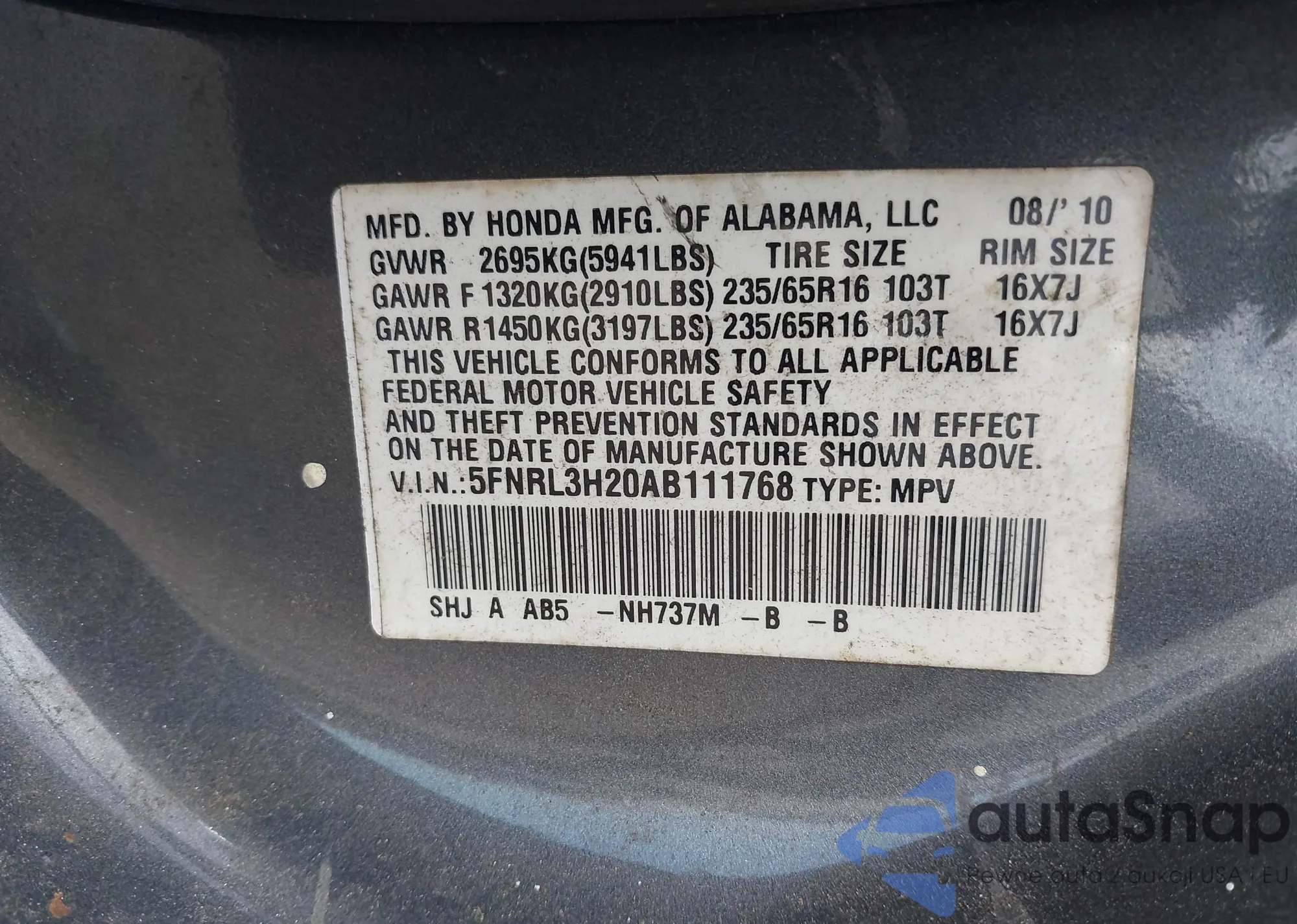 • VIN 5FNRL3H20AB111768