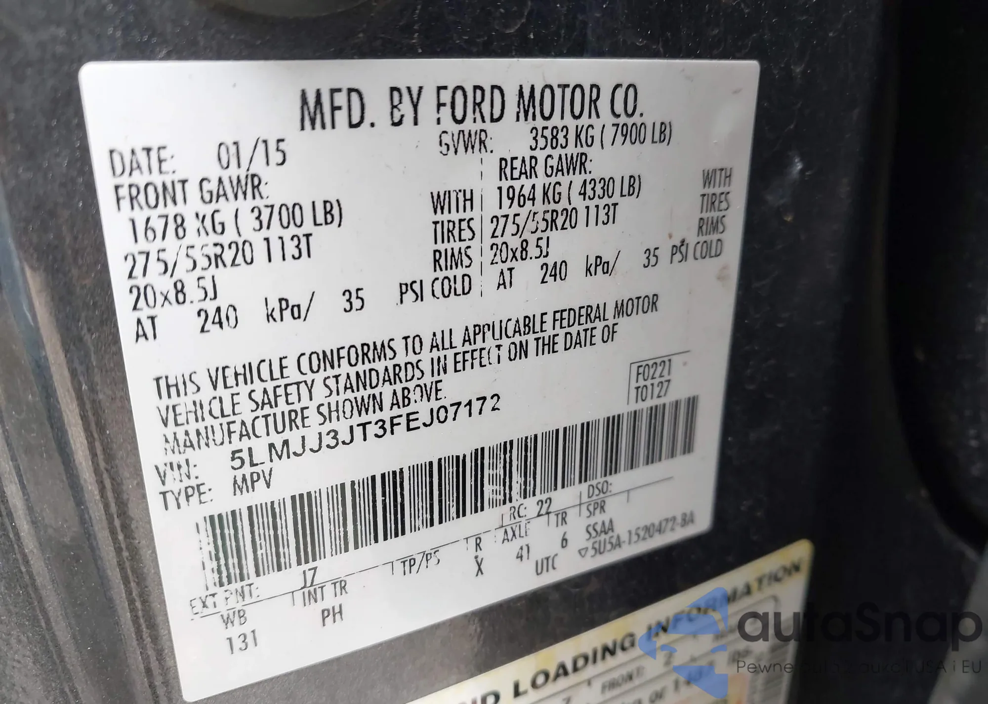 LOT: 42313343 VIN: 5LMJJ3JT3FEJ07172