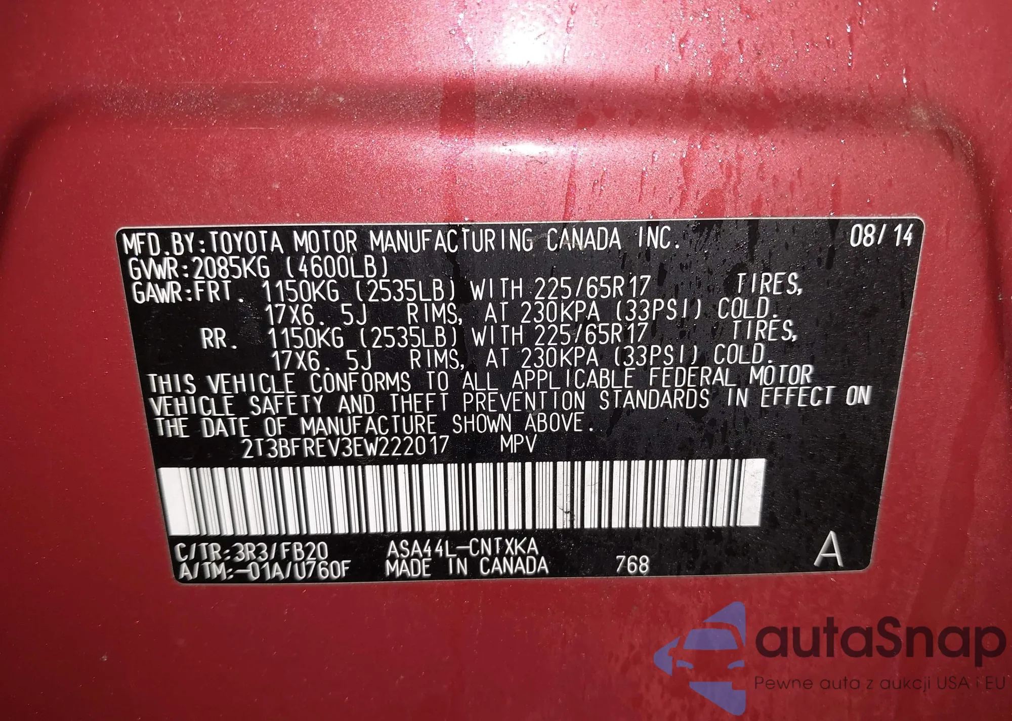 LOT: 42379958 VIN: 2T3BFREV3EW222017