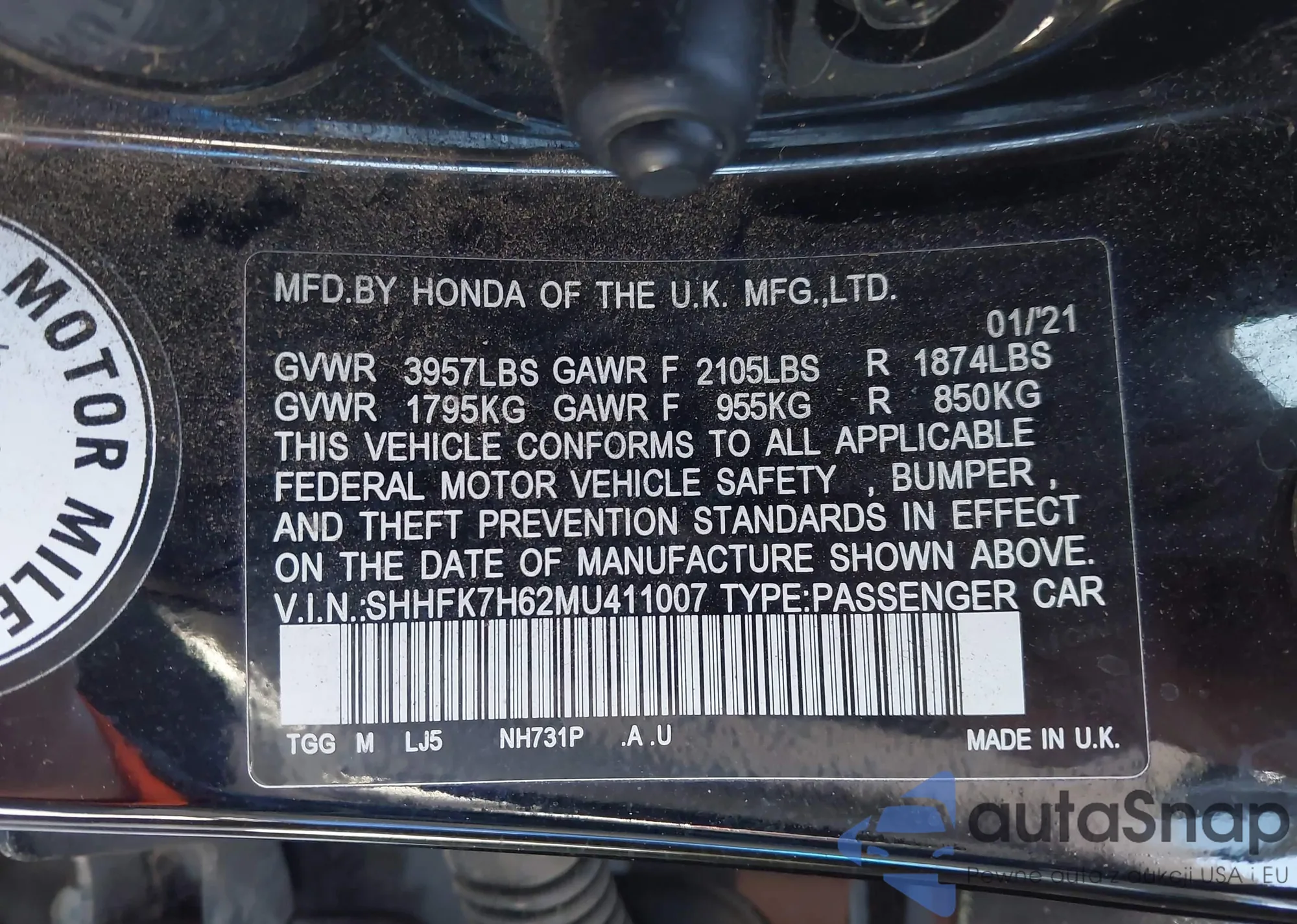LOT: 42000573 VIN: SHHFK7H62MU411007
