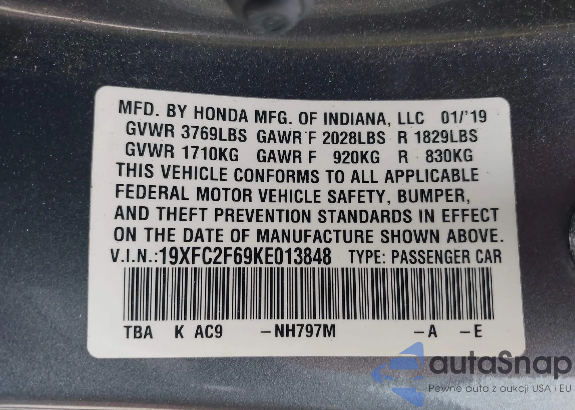 • VIN 19UUA9F74DA003069