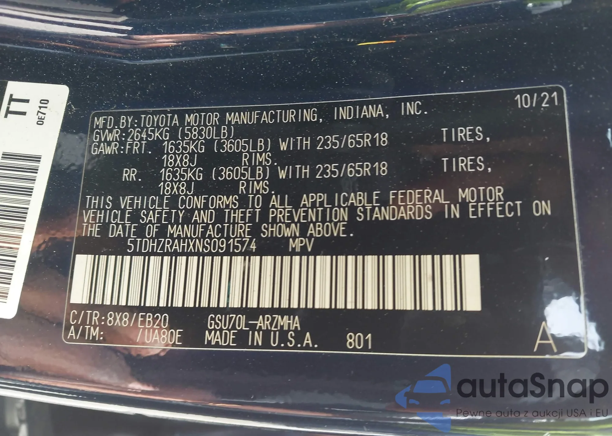 LOT: 42211660 VIN: 5TDHZRAHXNS091574