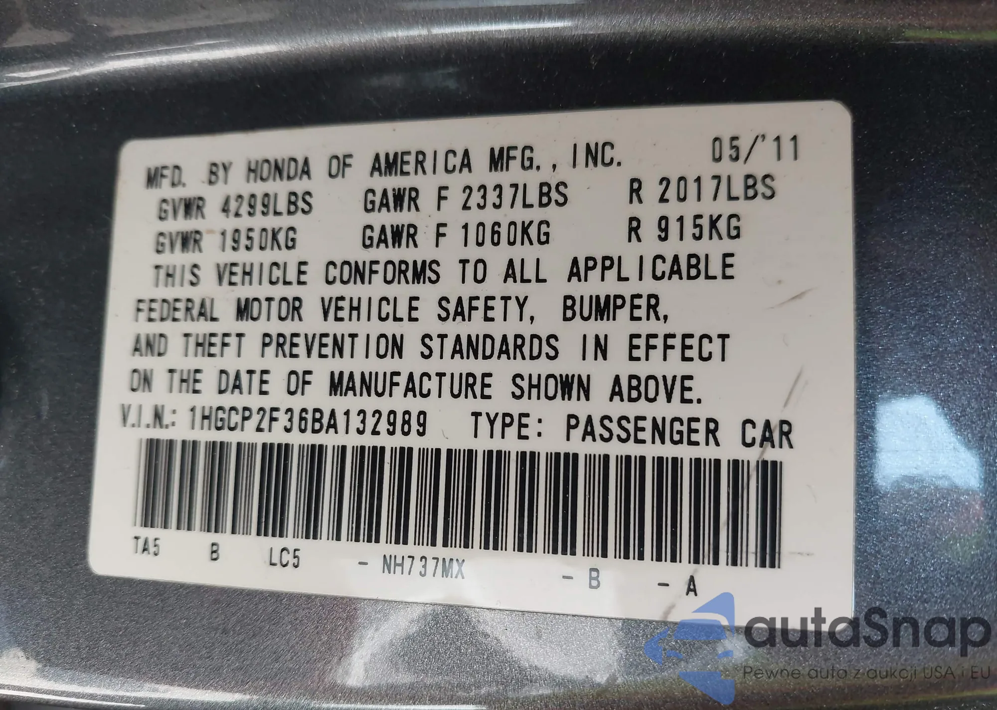 LOT: 42408024 VIN: 3HGCM56476G702444