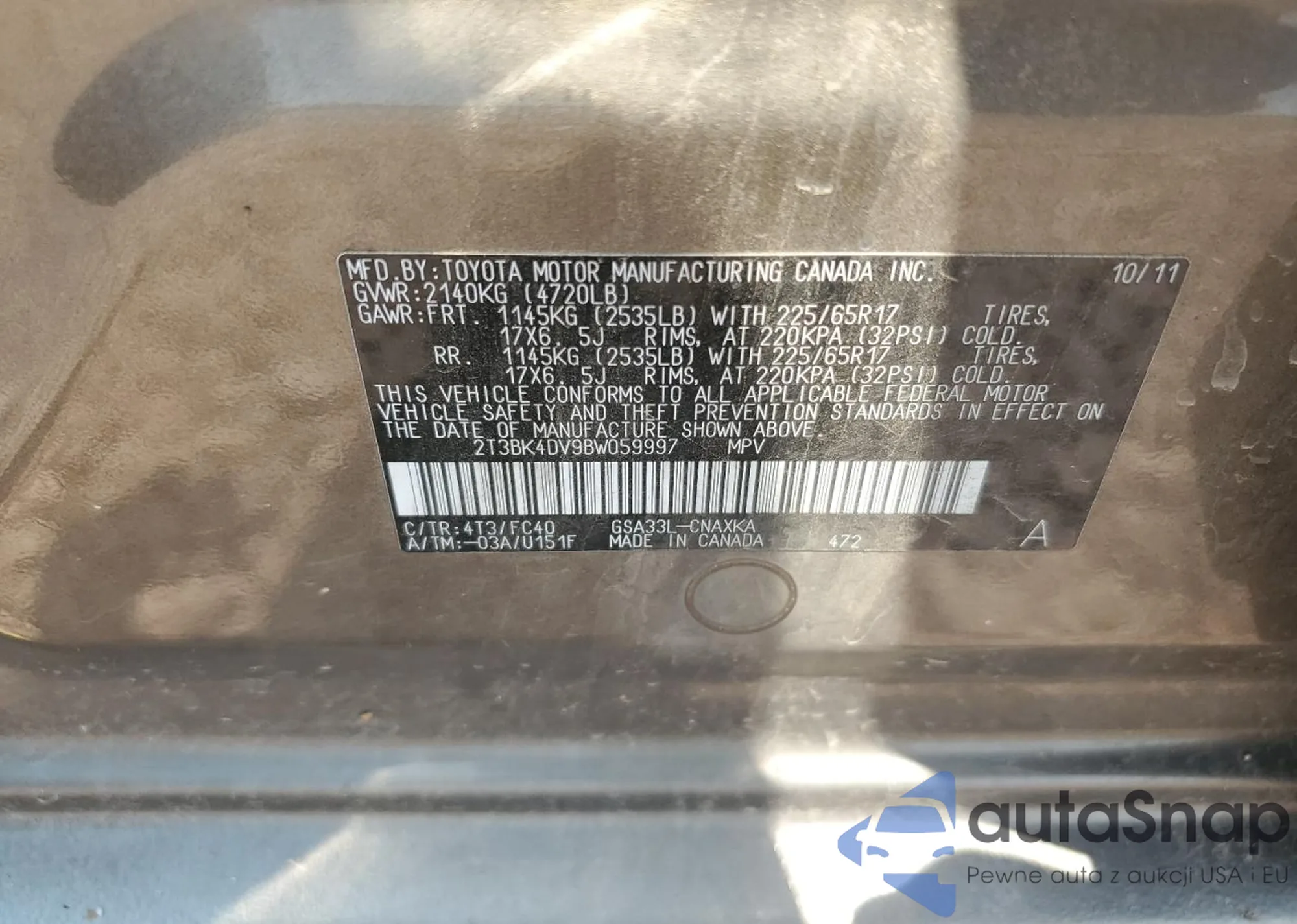LOT: 47856495 VIN: 2T3BK4DV9BW059997